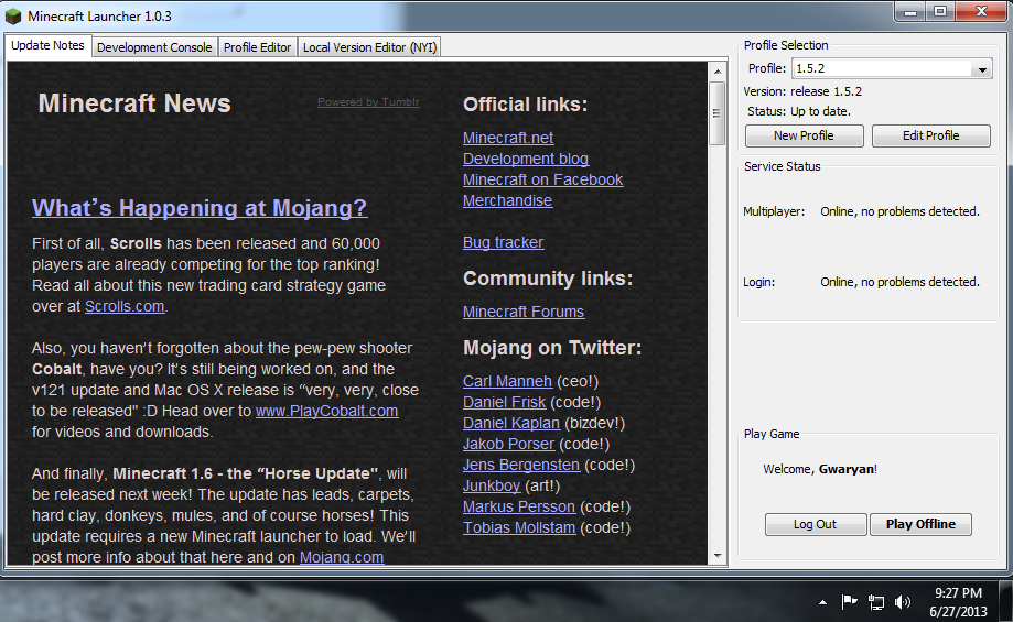 when using the profile selection drop down when switching between versions if you exit and reopen the launcher it forces one of the profiles to only be playable in offline mode (in this case it the default is prerelease 1.6 and secondary profile is version 1.5.2 and it forces the second profile to only be playable offline????????