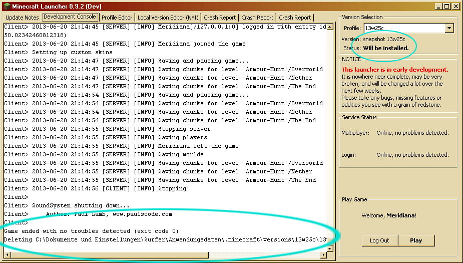 See attached Screenshot of my Launcher after logging off from 13w25c.