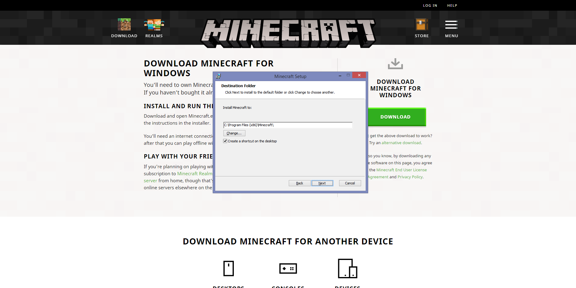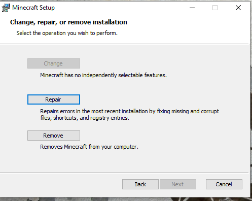 The installer from https://minecraft.net/download does not appear to detect my existing Minecraft install after being run. I expected it to show me the options to Change, Remove, or Repair the install. Instead, however, it only gave me the option to install. The install path it picked by default is where the game is already installed at. The image dfdSkBeU shows the interface I get when I run the installer (despite Minecraft being installed already), whereas image 8lp85tA is the interface I was expecting.