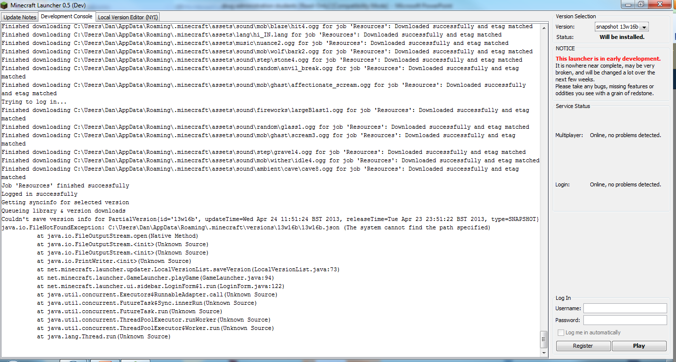 Couldn't save version info for PartialVersion{id='13w16b', updateTime=Wed Apr 24 11:51:24 BST 2013, releaseTime=Tue Apr 23 23:51:22 BST 2013, type=SNAPSHOT}