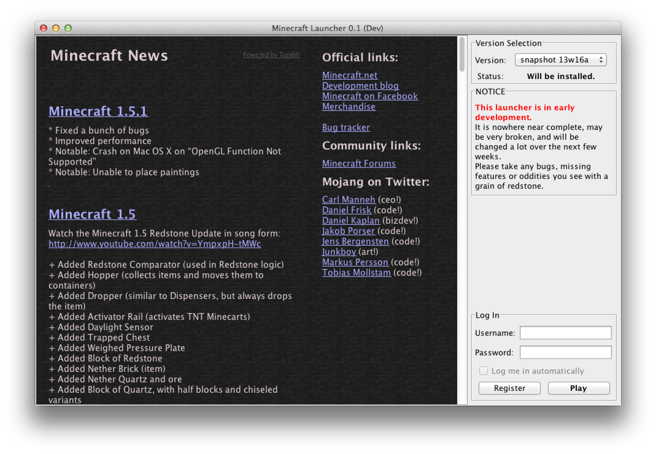 The development version of the Minecraft Launcher doesn't look too fancy with the Macbook Pro with Retina Display. Fonts in both the UI and web view are pixelated.