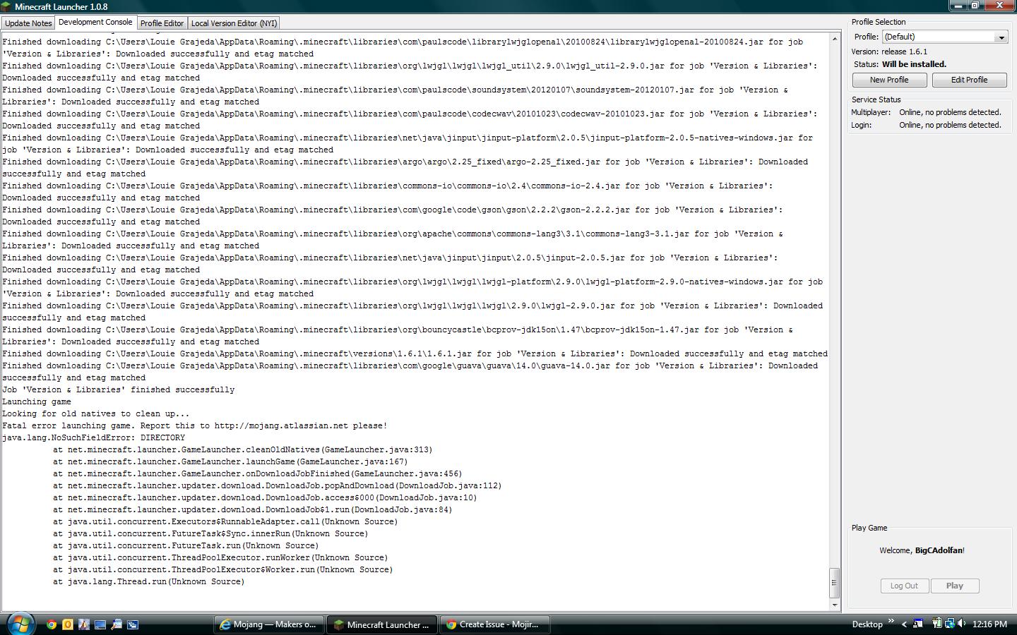 Fatal error launching game. Report this to http://mojang.atlassian.net please!