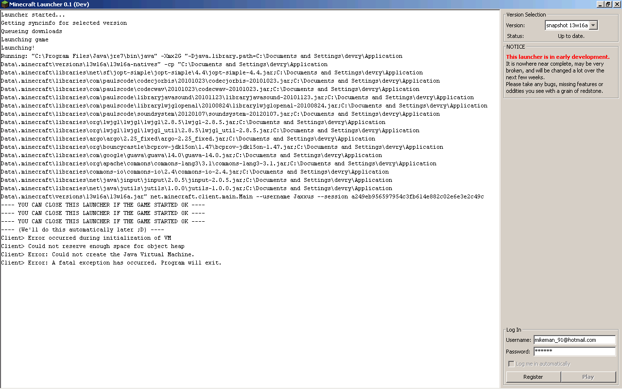 This was caused by accidentally reserving 2gb of ram, which is just a bit too much for old 32bit java. We'll give more control on how much ram to allocate later, right now it has been reset to 1gb.