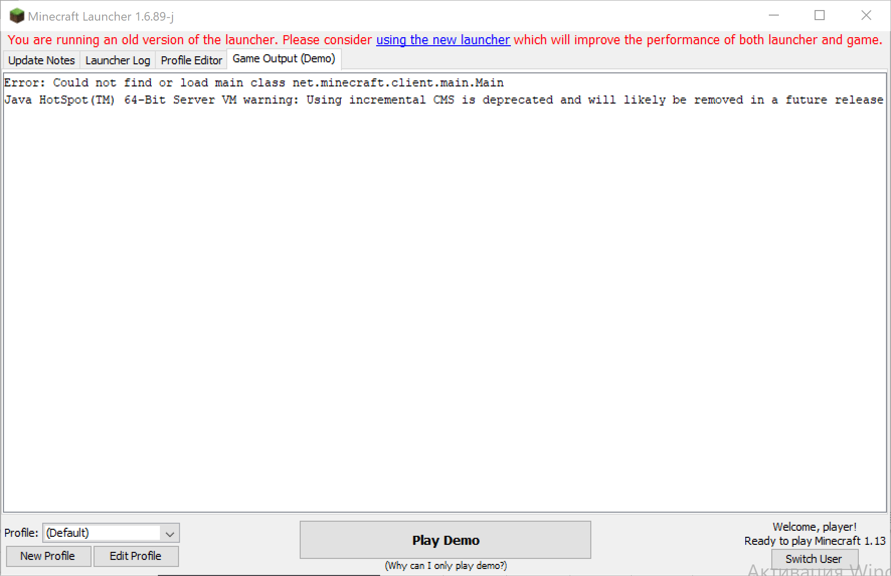 If use 1.13 in old launcher (1.6.89j), it works only if there is internet. If there is no internet I'm getting this in output: