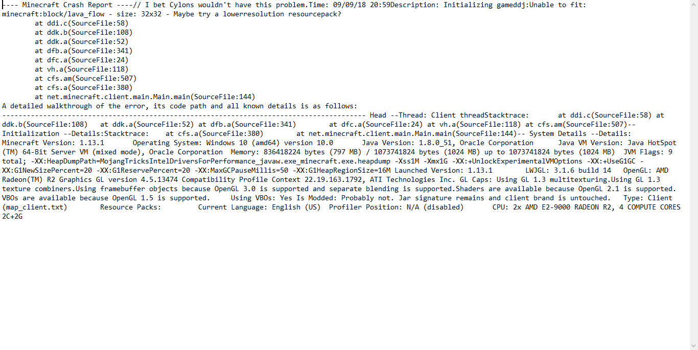 the game crashes when trying to load the game with report can't fit lava_flow maybe try a lower resolution resource pack. I have done some research and found there has been a report on this already I have tried deleting the .minecraft folder and reinstalling and have tried logging out and logging back in but that didn't work so I have turned to the dev to see if you could help. my username is stormy_owl if you need to know, I have attached a screenshot of the crash report. I await your reply,