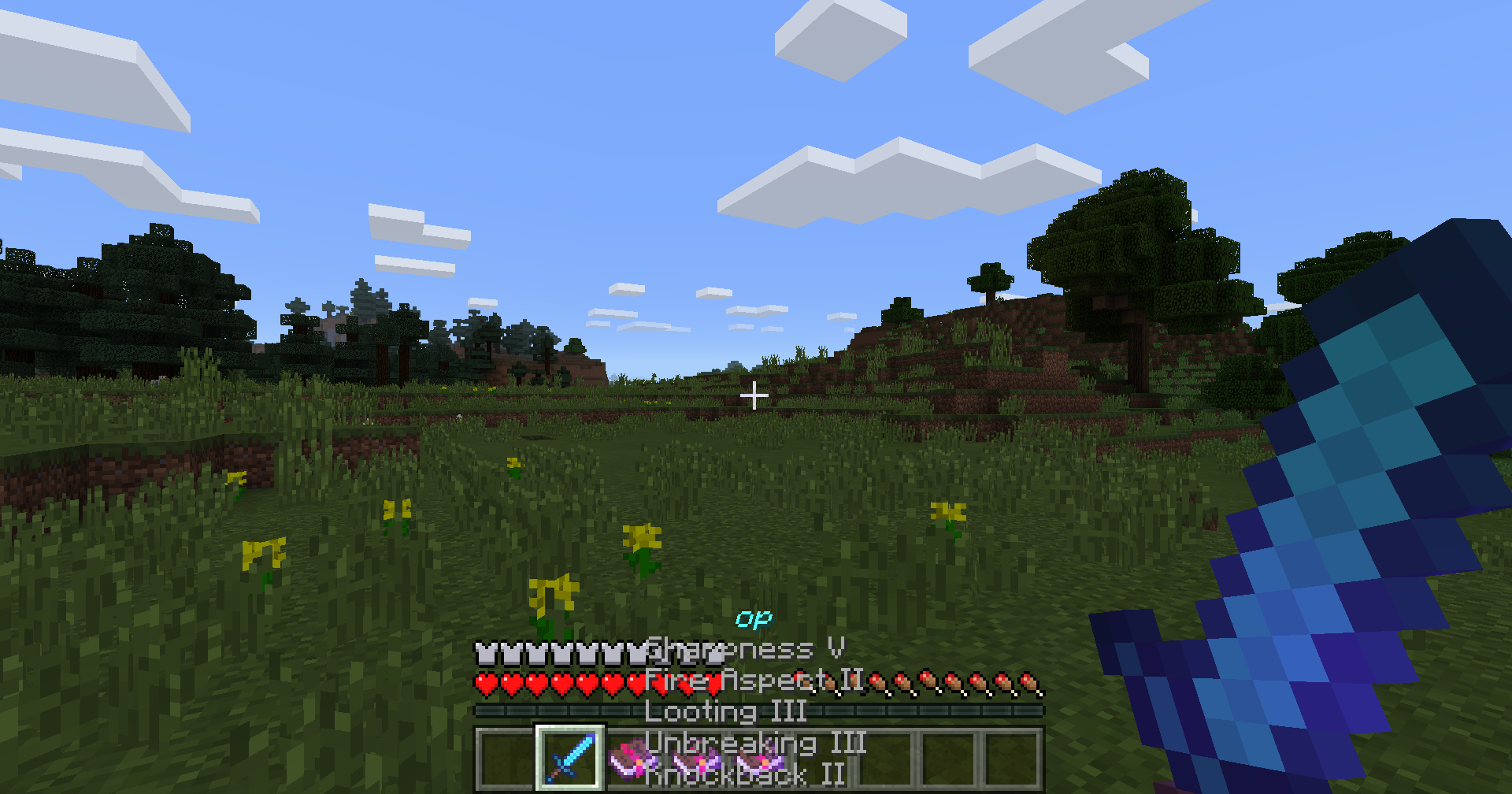 The player can choose between the blocks/tools in the quick-bar. If the player scrolls through the quick-bar a name of this item appears above the quick-bar. However the name cover the armor- and water breathing bar. Thereby the text is hard to read.