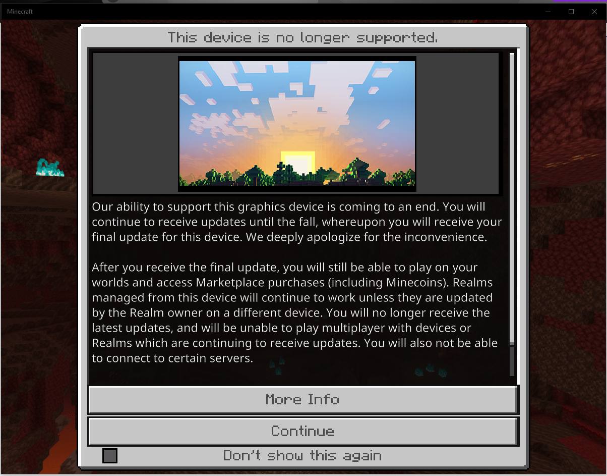 I booted up Minecraft windows 10 at the 1.16.2 update to realize that it had a notification saying that my device was not supported anymore after October 2020 but I went on to check the new system requirements from the Minecraft website and my graphics device an intel HD integrated graphics 3000 is running directx12 and it is proved in my screenshots if there is any other reason other than this please make it known to all because I know I am not the only one.