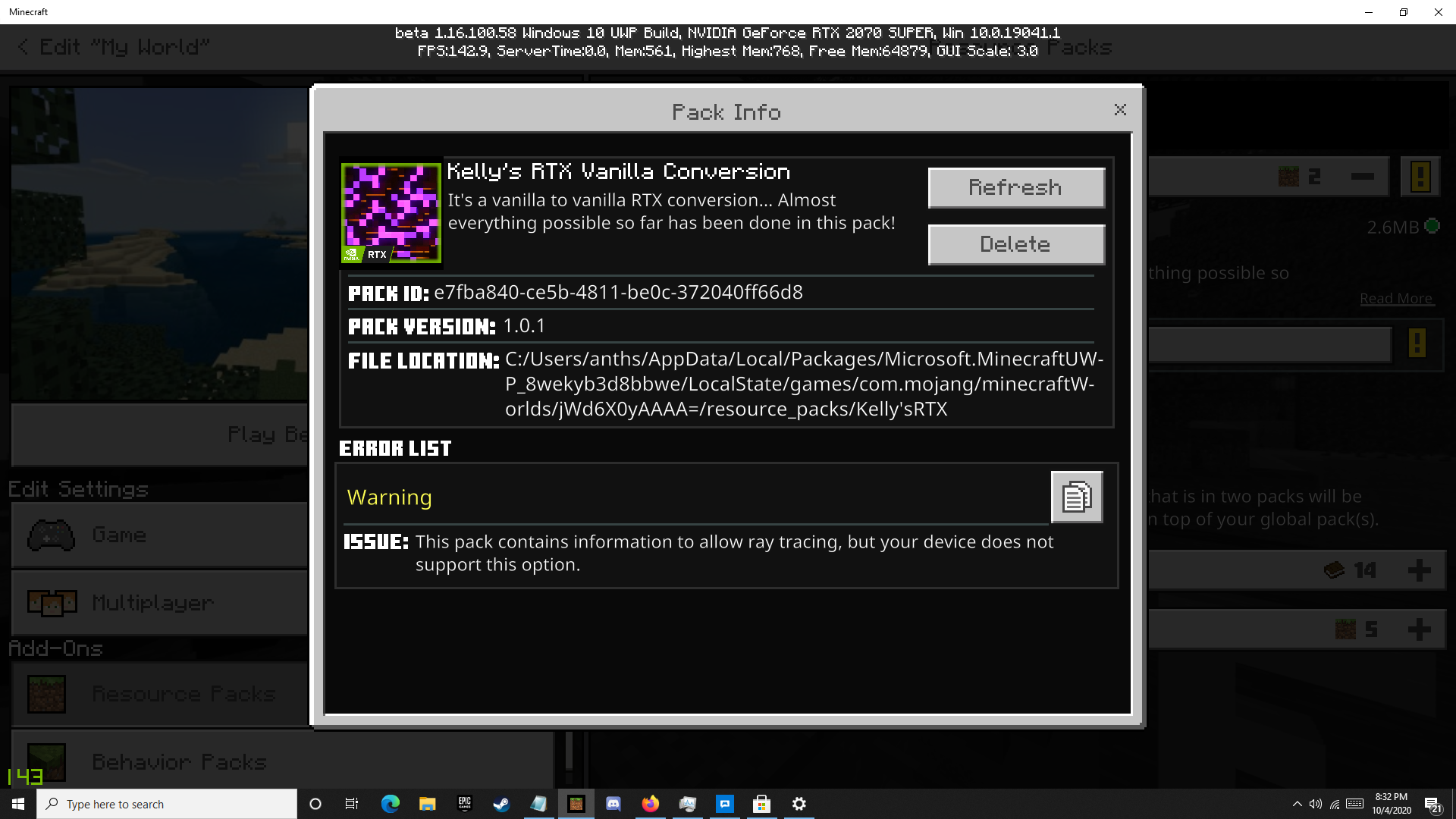 It keeps saying that "This pack contains information to allow ray tracing, but you device does not support this option." in the warning message for the pack/