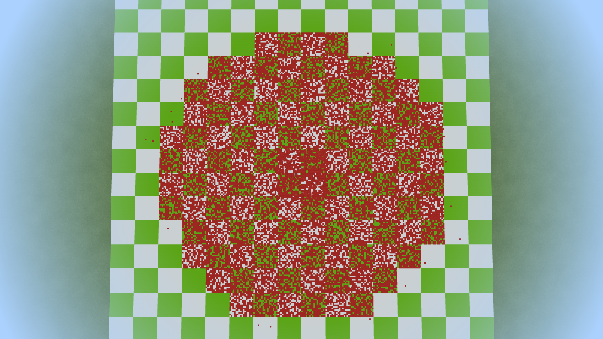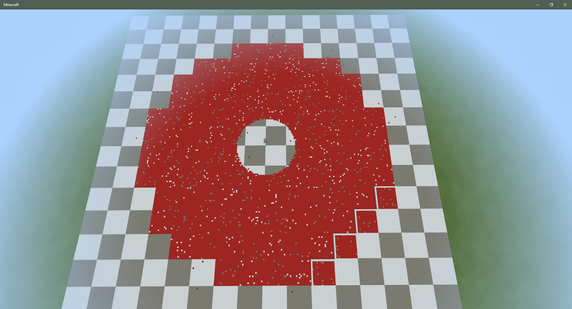 I ran tests at each Simulation Distance setting to show the pattern of spawnable volume for each. Tests were done in a slightly modified version of the world I used above, where red carpets mark the points where a mob spawned. In these images, there is a central red square of size 20 x 15 x 20 that marks phantoms spawning 21 blocks above the player's position. The space below this is inside the 24-block exclusion sphere; it had no red carpets in any of the experiments.