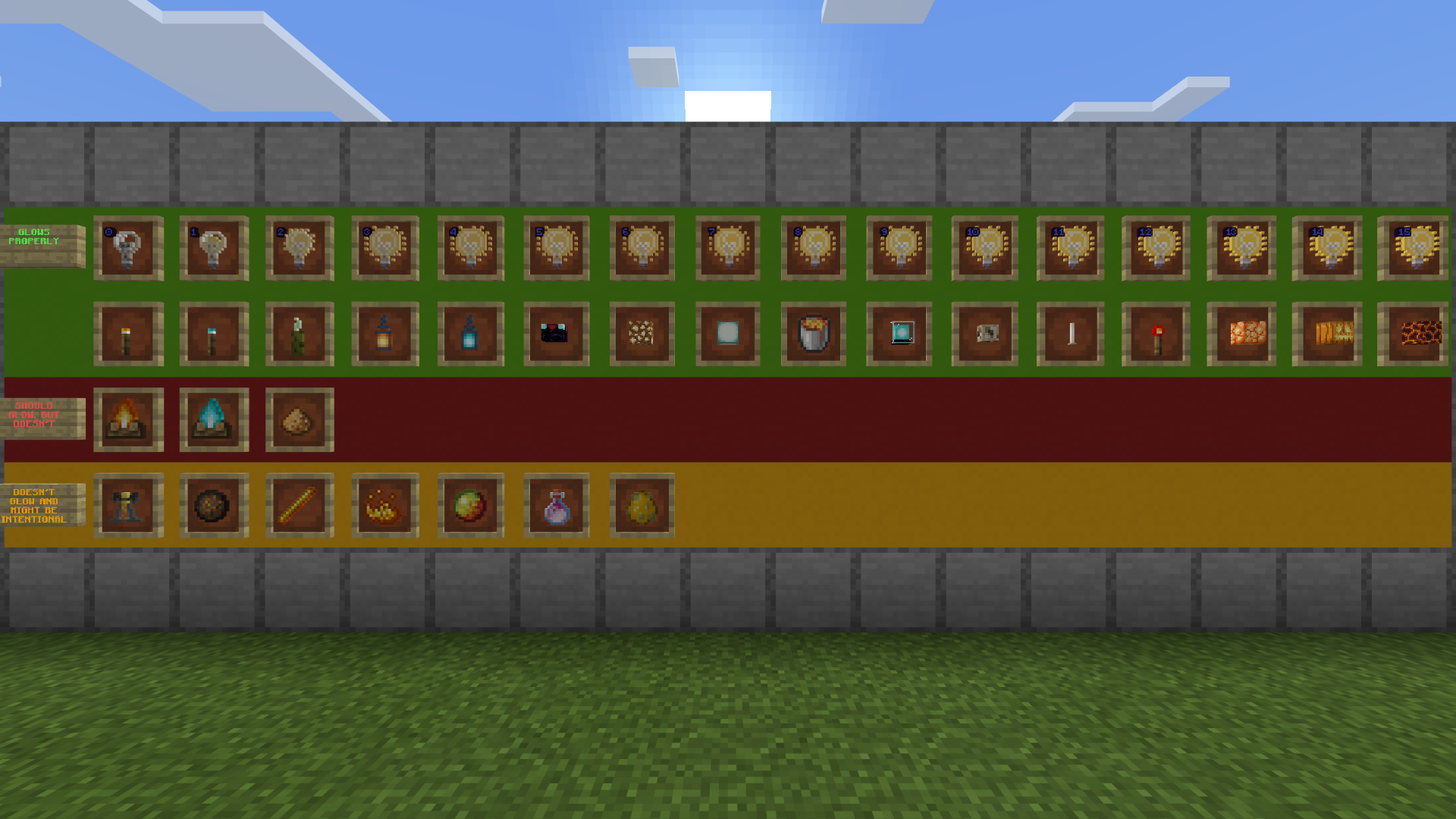 Light emitting blocks and items have a special "glowing" visual effect when being held or placed on an item frame. However, certain items such as campfires don't do the same. See both pictures for a comparison (Education Edition items not included).