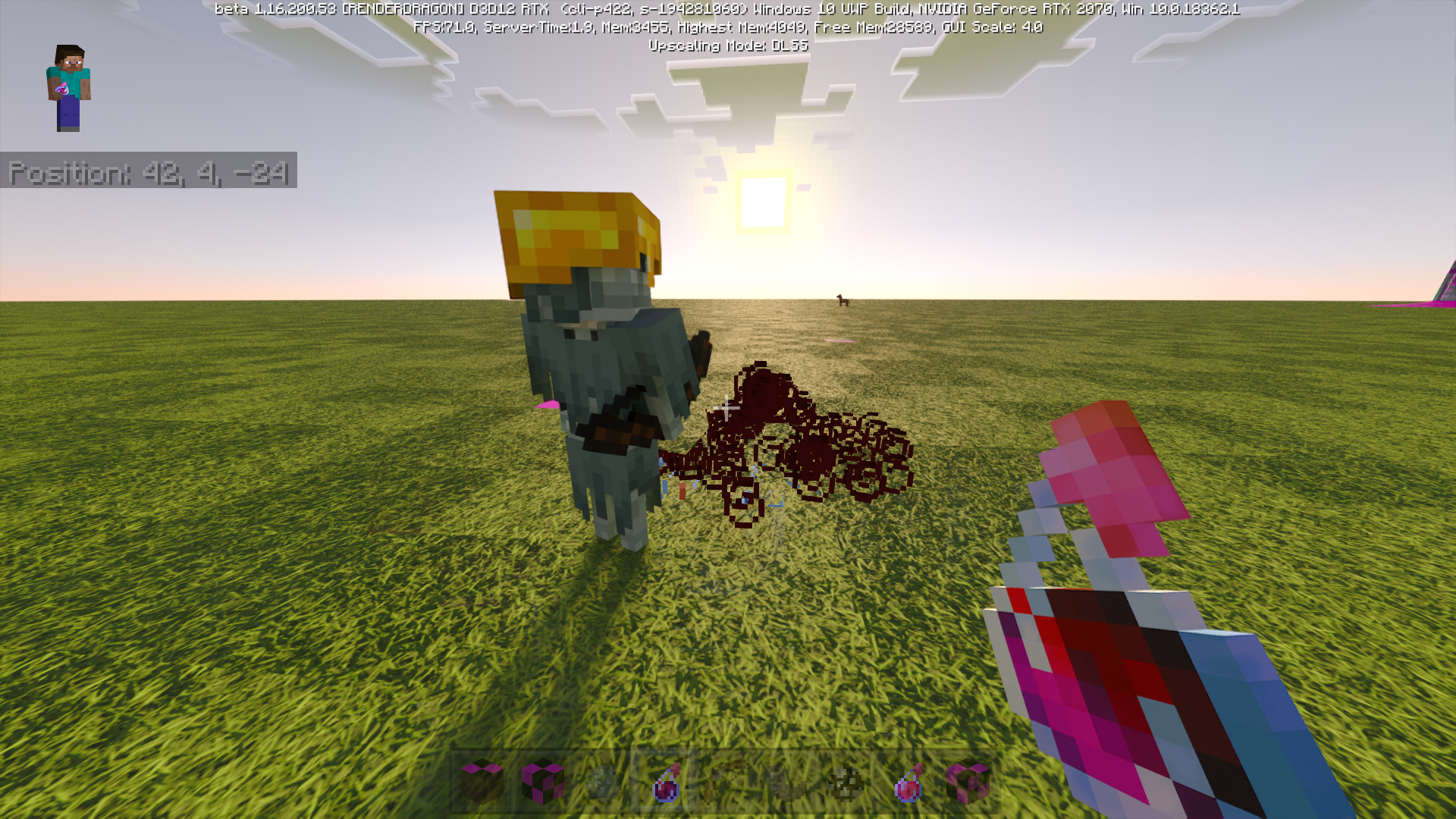 Potion particles don't render through alpha on splash potion entities, causing a square around projectiles where the particles are not visible. It occurs with any particles and any entities, and does not occur when RTX is turned off.