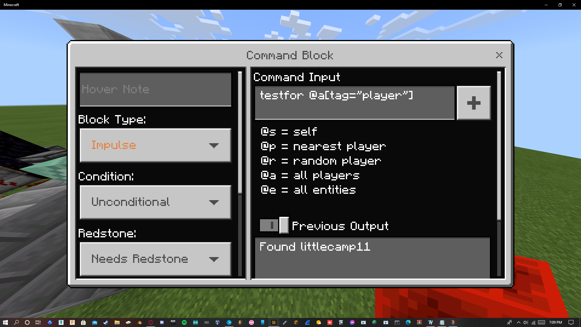 I was trying to make a command that would act as a data command. I have the starting command on a command block, on "impulse", "Unconditional", and "needs redstone" set to "testfor @a [tag="player"]", with a redstone comparator in front of it going into another command block. The comparator when the command block isnt powered stays on