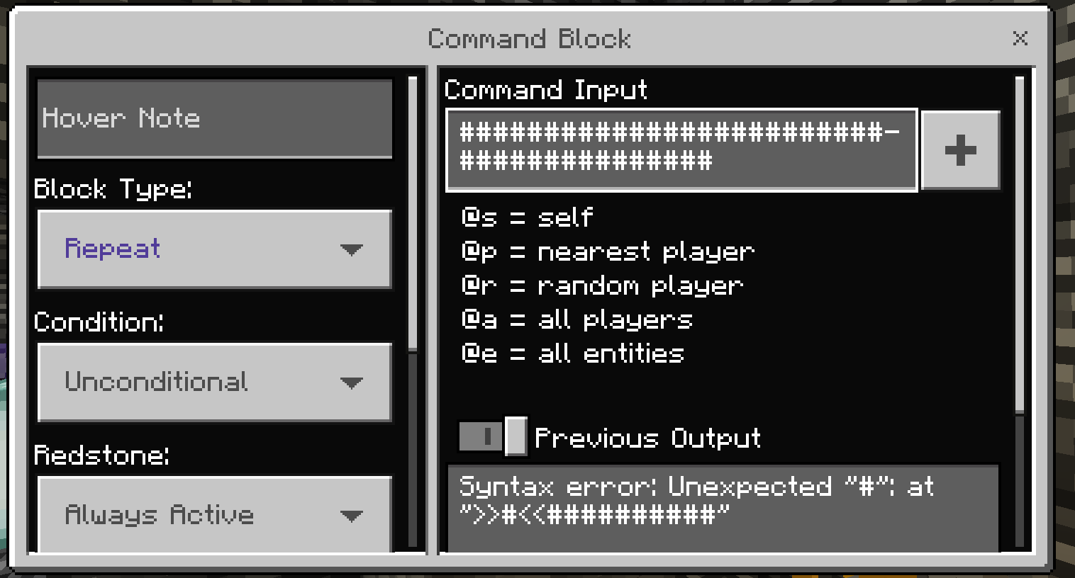 When typing certain commands into a command block, upon reopening the command block every character of the command will convert into a pound (#) symbol and the command will not function.