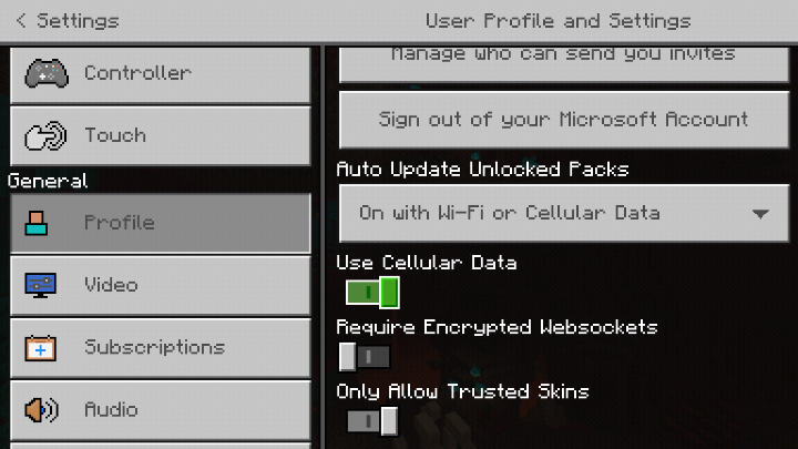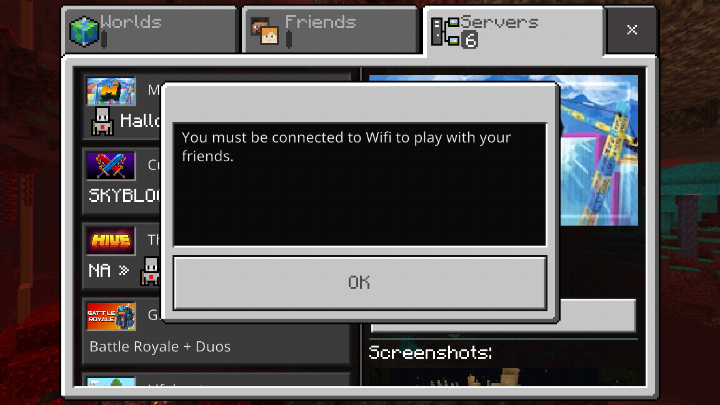After updating to the latest version of minecraft v1.16.1, I cannot not logon to any servers. I'm blocked by this message, "You must be connected to wifi to play with your friends". In the profile section, I have "celluar usage" ON and "Auto Update Unlocked Packs" ON with WI-FI or Celluar Data.