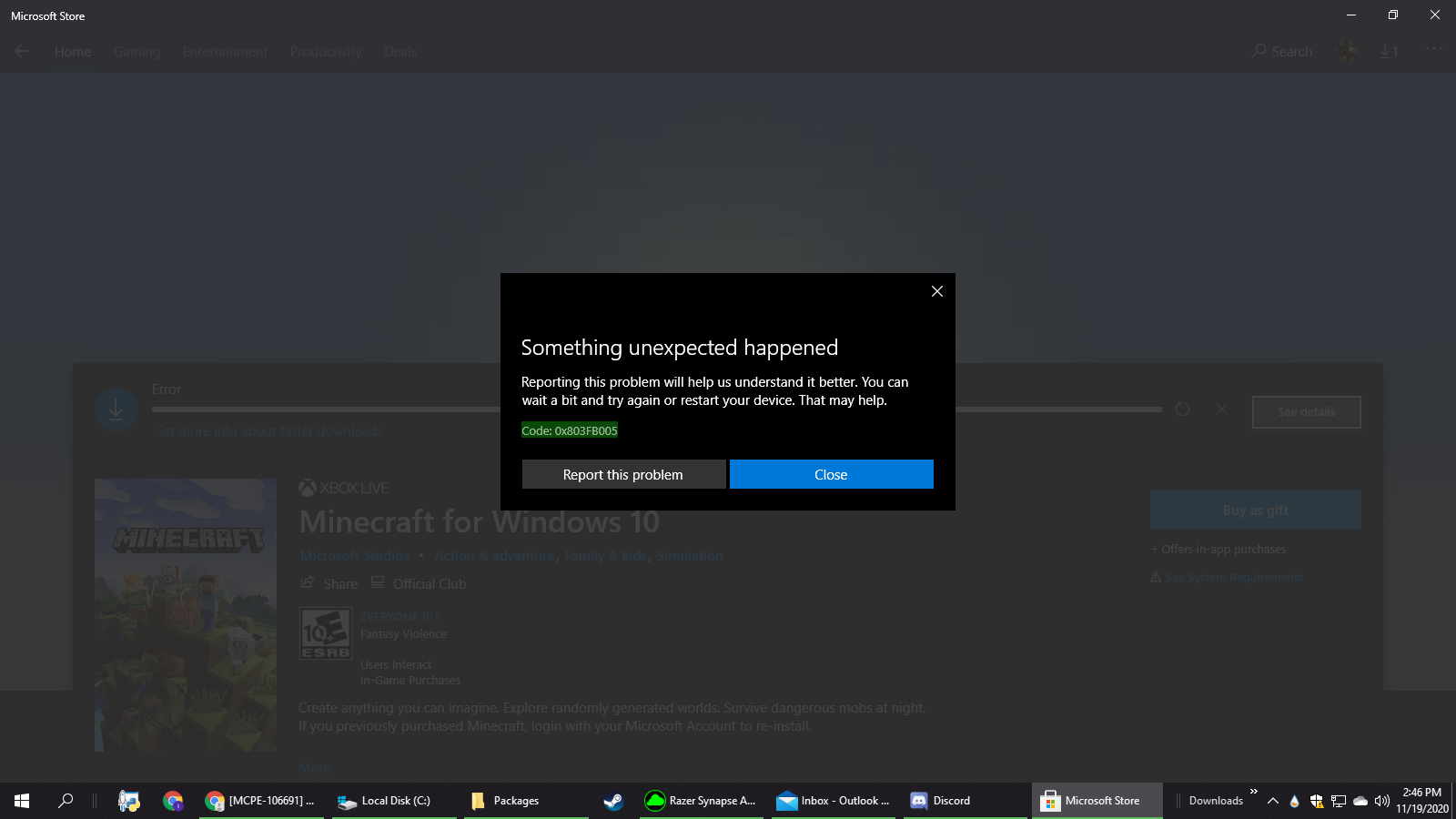 After having issues trying to update to version 1.16.100 I chose to uninstall Minecraft from my computer but when i went to reinstall MineCraft im met with this error code