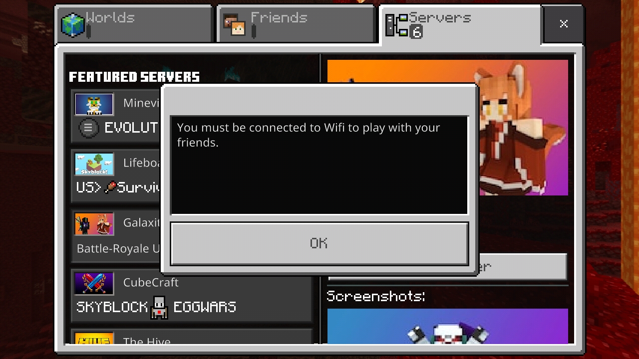 I have set my settings to use cellular data since i don't have wifi. Even though i have done that, it still won't let me join the server i want to be in. It just keeps saying that i have to have wifi to play with friends. It has done this before, but i changed the settings to use cellular data and it was fixed. I had to update the game and now it won't let me join again even after i switched to cellular data in settings.