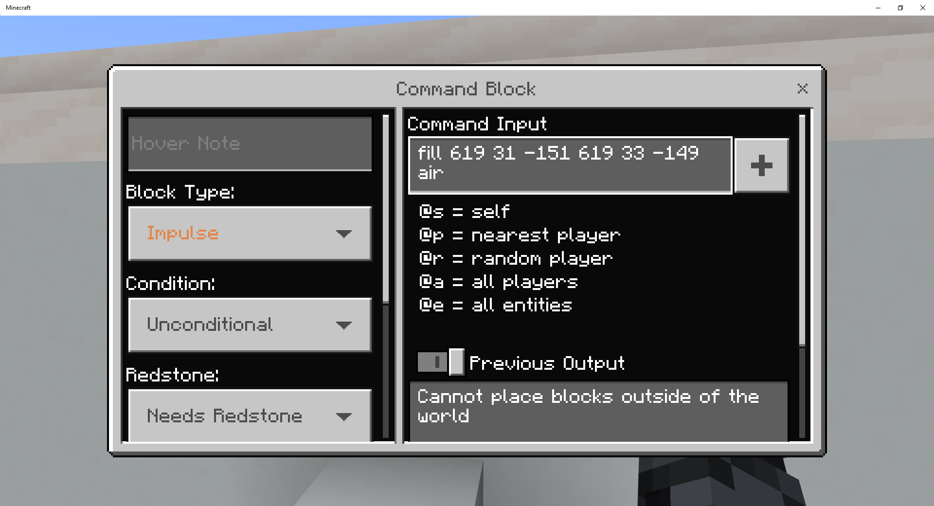 then it shows could not place blocks outside of the world. I try this command from this coordinate 452 84 72 ...Please Fix It