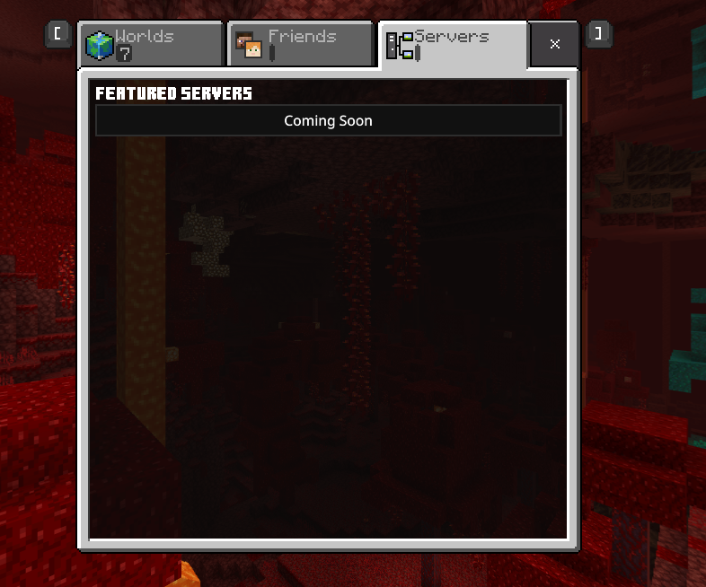 This might affect other versions too? Basically I can't see servers on my laptop but my friend who has the exact same type of laptop and version does have servers. I'm pretty sure this is just a glitch on my end but if there's any fixes out there please tell me. (I have tried resetting my computer, uninstalling and reinstalling Minecraft, changing visual settings and even waited at the servers bar for abt 15m) Edit: I'm pretty sure nobody made a page for this version showing servers coming soon. (If servers are coming soon then sorry for wasting your time)