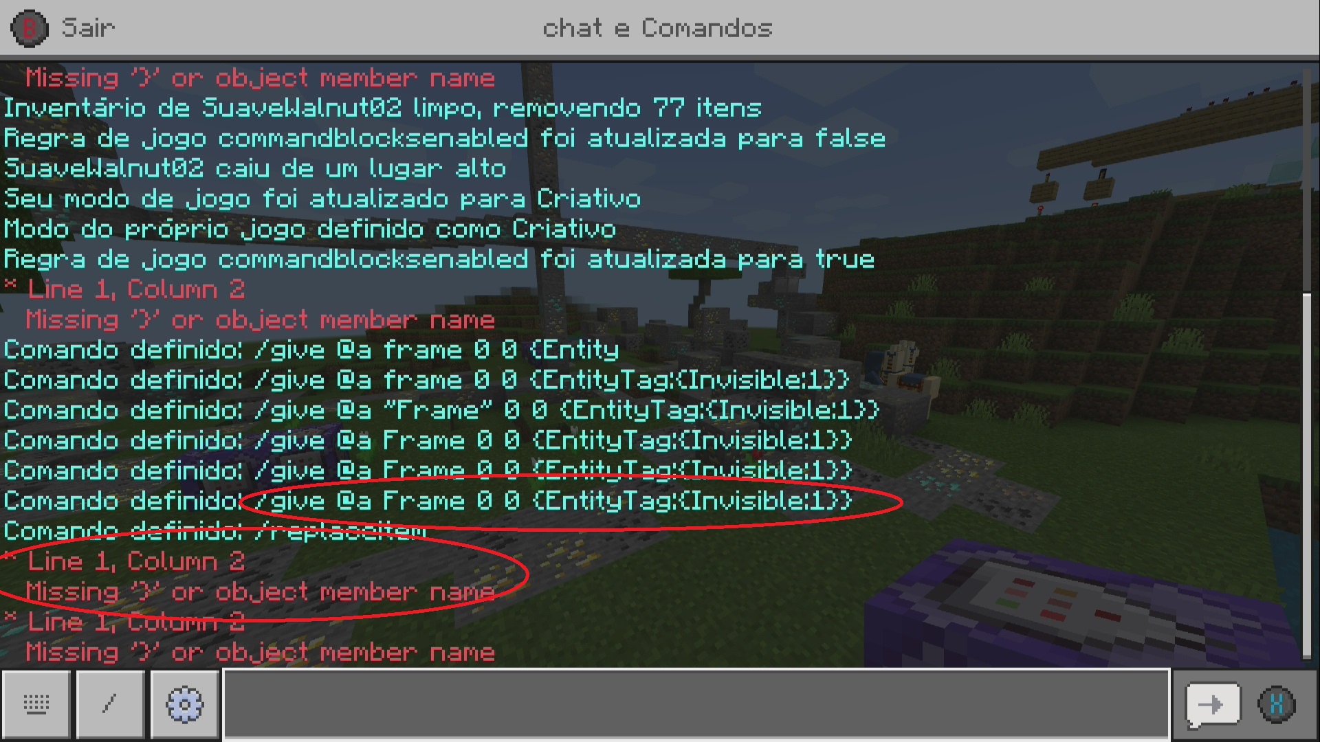 When making the frame item command invisible (/give @p frame 0 0 {EntityTag:{Invisible:1}} ) appears error Line 1 column 2 missing '}' or object member name
