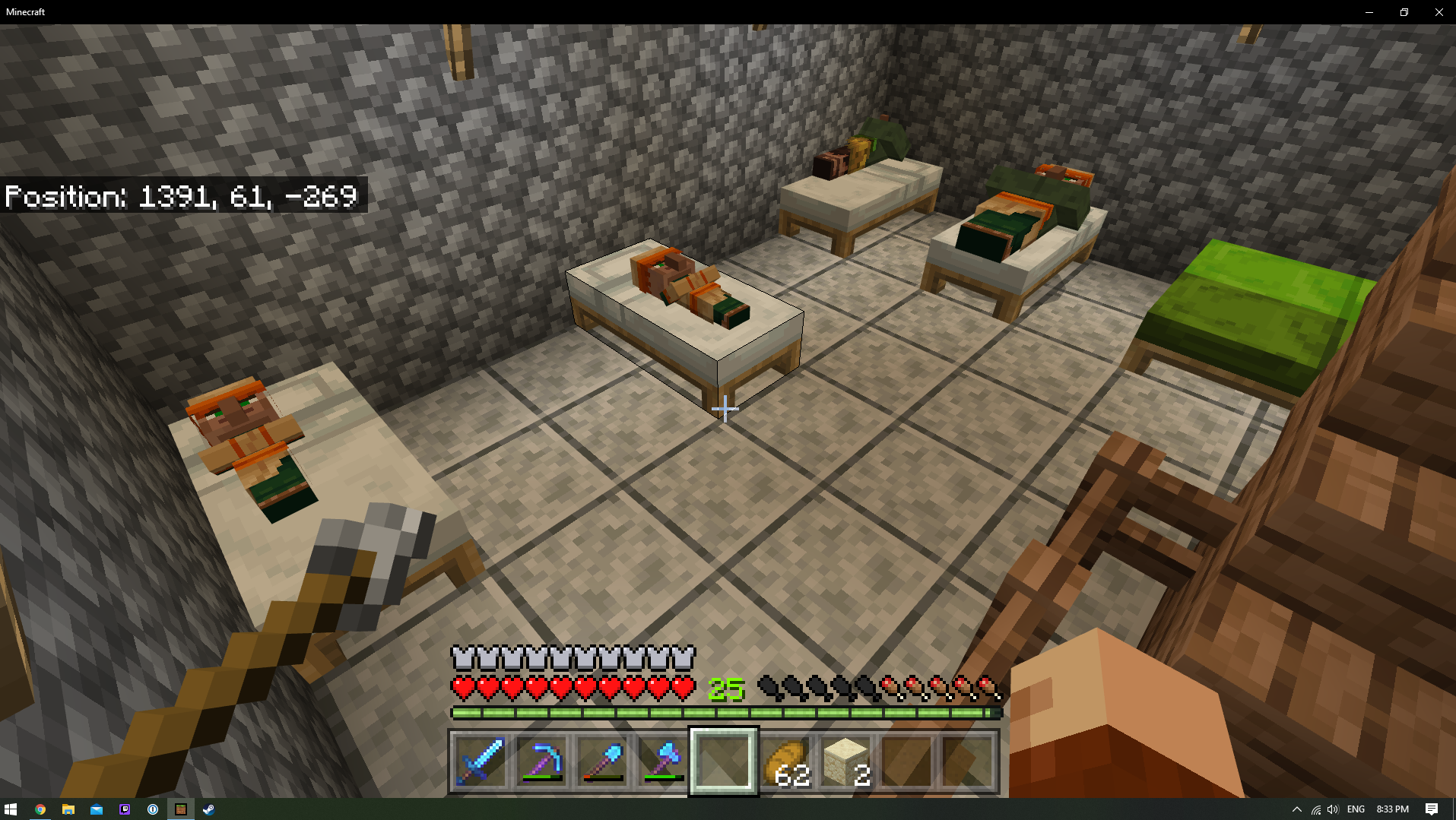 At night, when a villager enters their bed, they slide off. Sometimes they lay down off of their bed and then slid onto the bed while laying down. The next morning, some of my villagers that slide into the wall seemed to have vanished for a while and I thought they vanished, but they did reappear.