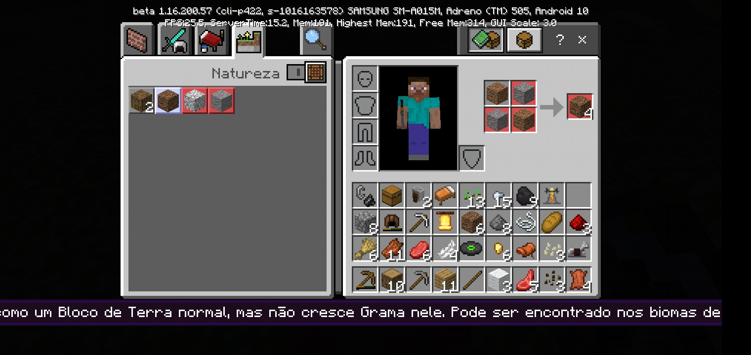 In the Portuguese language of the game, a giant section appears in name of the Coarse Dirt block, instead of just being the name of the block.