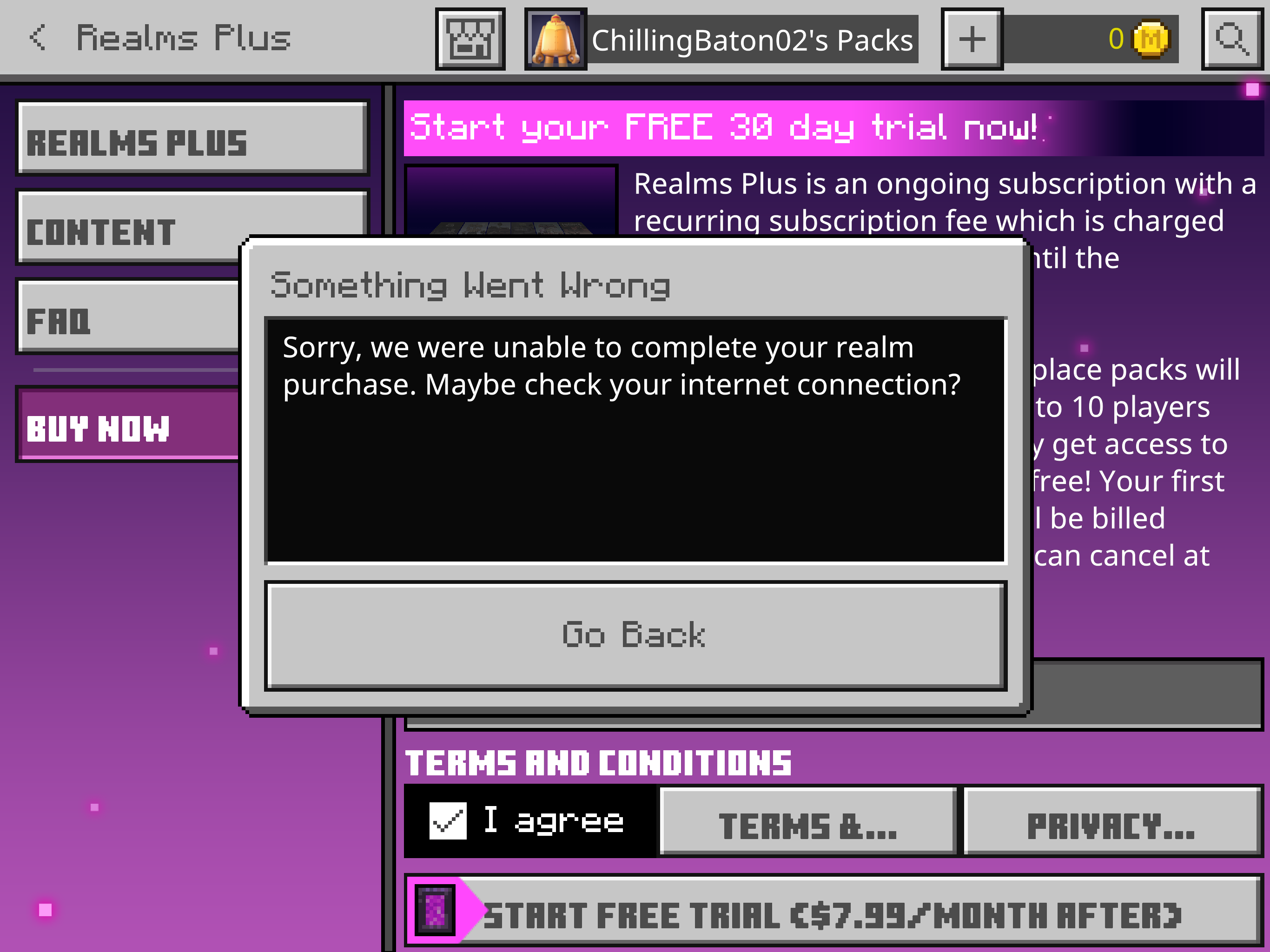 I was trying to start a realm and it keeps telling me something went wrong. My internet is perfectly fine