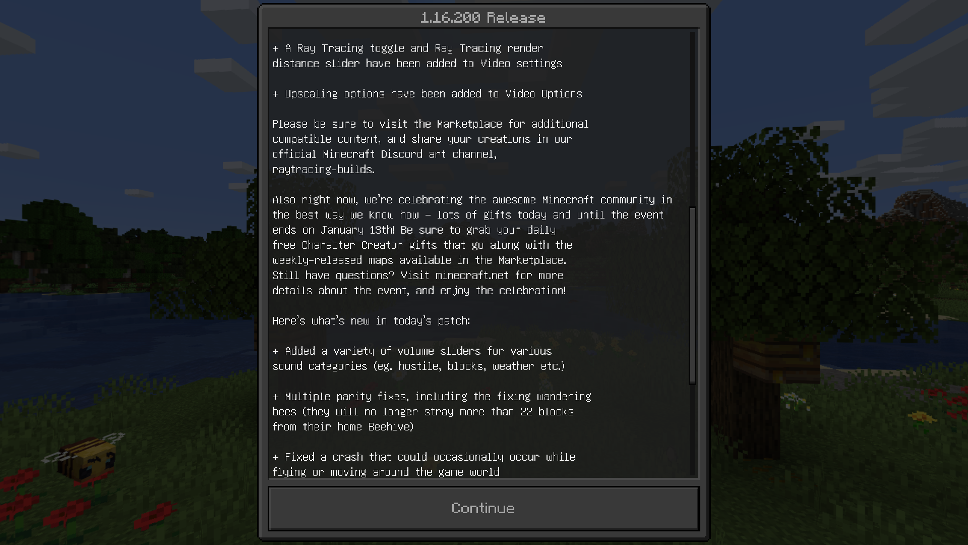 According to the game, the new 1.16.200 update is supposed to add new options for sound and video settings. However, every time I go to check it out its the same as it was last update and nothing is there as promised. My friends said they can all see the new options and keep in mind none of us have new hardware such as RTX cards or anything so its just me that's affected and I don't know why. Please fix soon!!