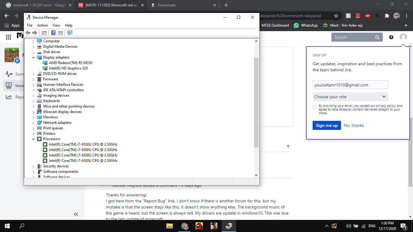 It isn't related to any of these articles OcelotOnesie, once I got the 1.16.201 update, I get a red screen with the menu music playing in the background, the play, settings and marketplace buttons are pressable but all I see is the red screen. Also I will upload a photo of my specs and a video of the bug, and I am saying that from now, it isn't a driver issue because all my driers are up to date.