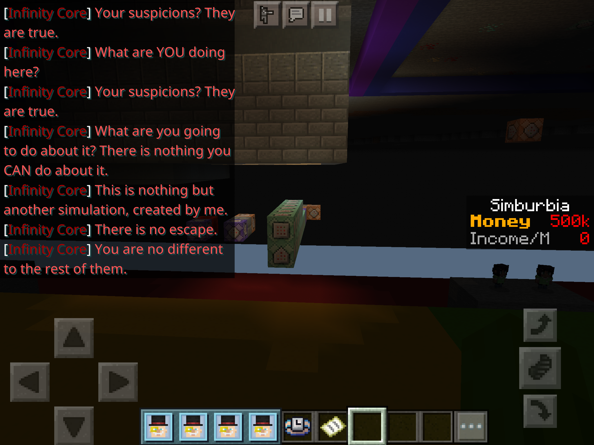I was playing Minecraft simburbia with my best friend. We put it on creative mode, and turned dug hole underground. We saw a huge, colorful platform with command blocks on it, and I messed with one of them to cause a thunderstorm. And then it happened. It started out funny, where something called the “infinity core” Kept saying, ”What are YOU doing here,” and other things. But when I fixed it, the lightning kept going, and the infinity core said, “there is no escaping. You are just like the others.” It said some other stuff about how it was going to kill me, too. We suddenly went into survival mode again, and instantly died. It said we were in creative in the settings, but we weren’t. Eventually we went back into creative, and when o went back down to the command blocks, there were a bunch of frozen people on the platform, and the infinity core said, “you are just like the others.” I saw a box, and saps onto my mike, “I think I can stop it!” Then me and my friend got kicked out of the world. Mikes don’t even connect to the game! Later, in my IPad, I checked it out again. The infinity core said the stuff again, but I just checked the box. Unfortunately, it was just where you start in the game. Please fix this, I had trouble turning my light off for bed.