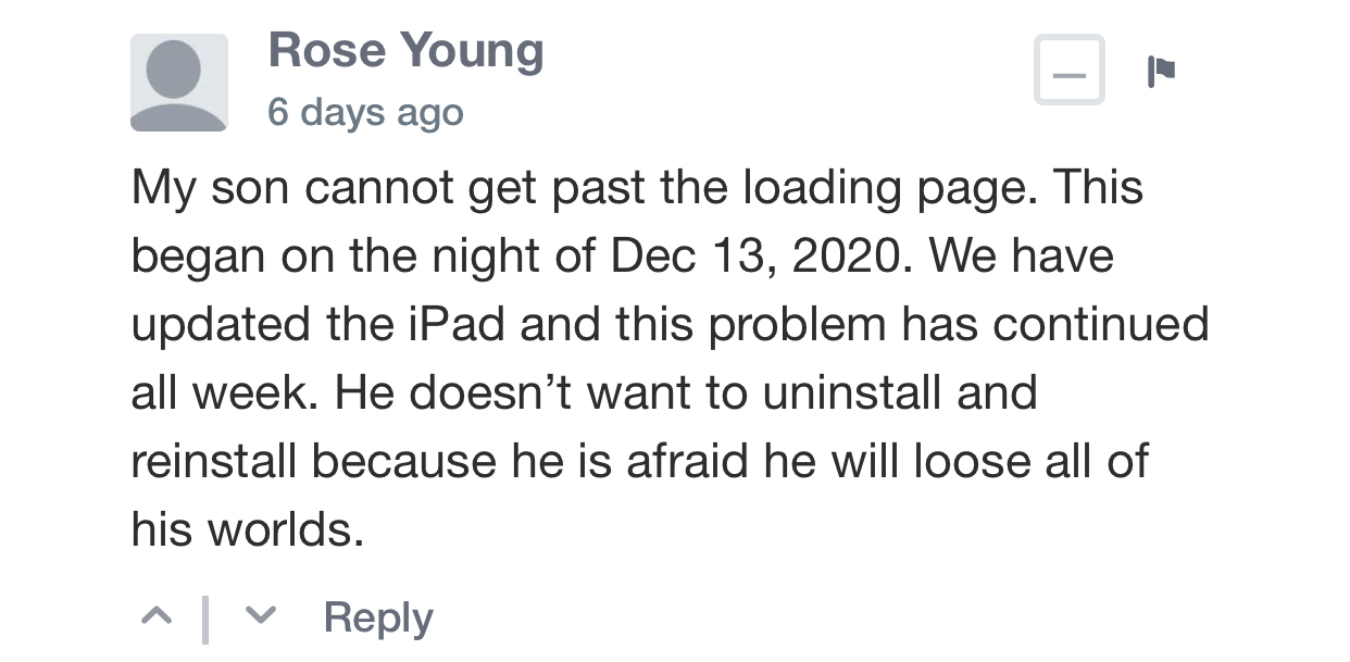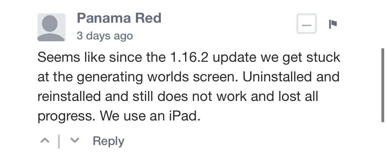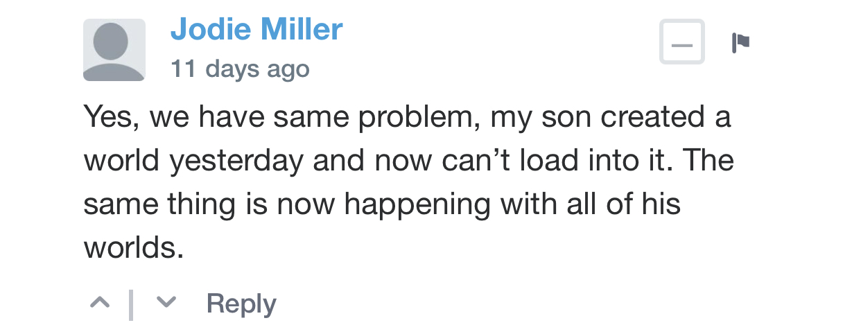 So I took a break from Minecraft on October 30 and continued to do so up to November 28. I tried accessing my main world and it completed the generating bar completely and proceeded to cycle through the loading screen tips for a solid few minutes. I exited and refreshed the app and tried again, it did not work. I also tried accessing my backup worlds and tried creating copies and accessing those copies and it repeatedly generated the bar and then cycled through the loading screen tips. The longest I waited was around 10 minutes before I gave up. Eventually it did load up a few days later but did not completely generate my surroundings and was thus laggy so I quit. Today (December 23), I tried to access my world again and it proceeded to have the exact same error so I decided to force quit and then try again, it did not work. So I force quit again and this time loaded up a brand new world which loaded up within 20 seconds. I played for around an hour and closed my phone for dinner. When I came back and tried to load up the brand new world I made today which was working just fine a couple of hours ago is now experiencing the same problem as my otherΒ worlds. Not sure what is going on? I read a few similar messages on other unofficial forums and I couldn't find anything on here or the support page so I decided to type this outπ₯Έ I have attached a few similar reports from this forum >>>>>>>>Β https://www.product-reviews.net/down/minecraft-pe-app-problems/