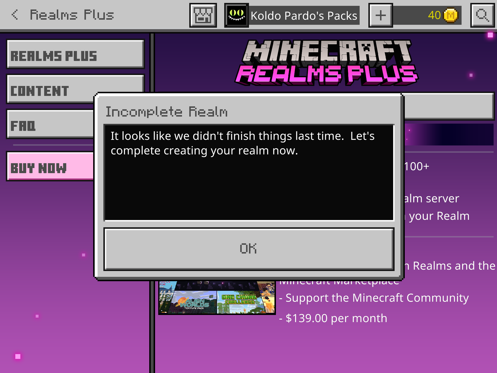Today I bought a realm to play whit my friends, but when I want to create a world, it appears to me: Your purchase succeeded but we couldn't create your realm right now. We will create your realm as soon posible. Check back later on this device