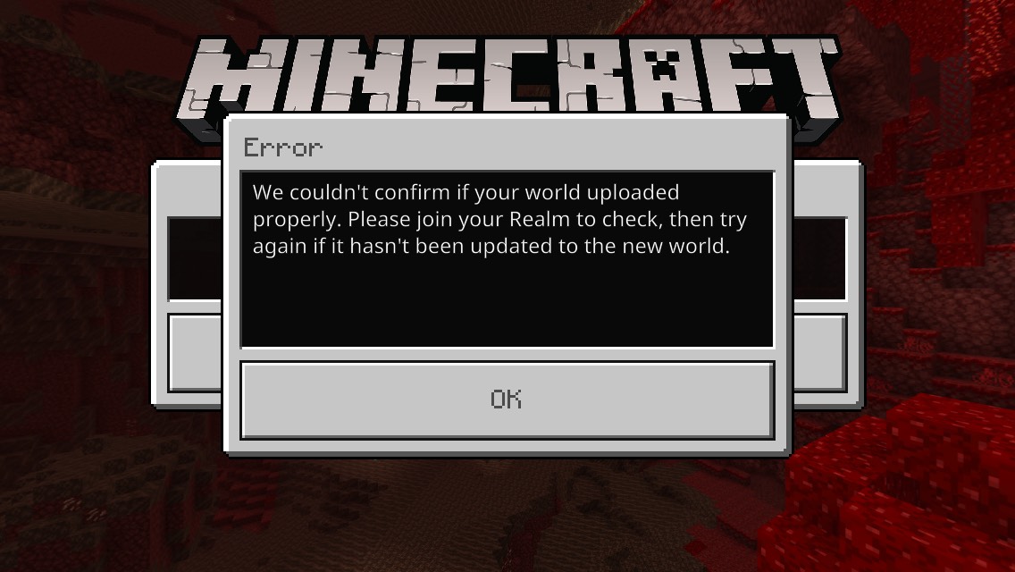 I have recently bought a realm and tried to upload one of my worlds to it on pocket edition. The world was about 40mb and had about 6 mod packs on it. When I tried to upload the world it went through the exporting process, but when it got to the initializing upload part, after about 30 seconds an error window popped up saying "We couldn't confirm if your world uploaded properly. Please join your realm to check, then try again if it hasn't uploaded to the new world." I joined the realm and the upload was unsuccessful, so I tried again. Unsuccessful. I tried to upload a brand new world with nothing added to it and the same thing happened. I tried to reset/close the realm and it wouldn't let me do either of those. This is only an issue on pocket edition.