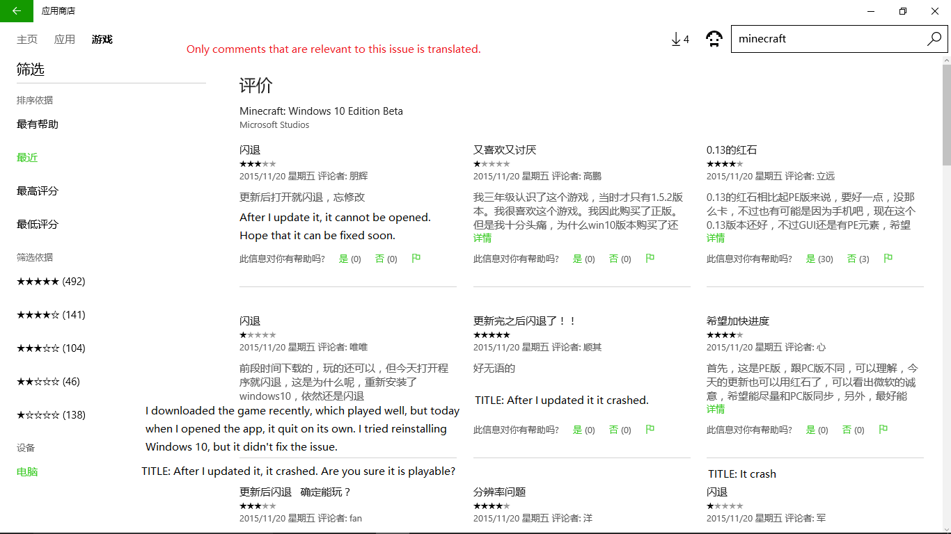 Some latest comment from Chinese Windows store with translation. Translation might not be perfect, since I am not that good at English.