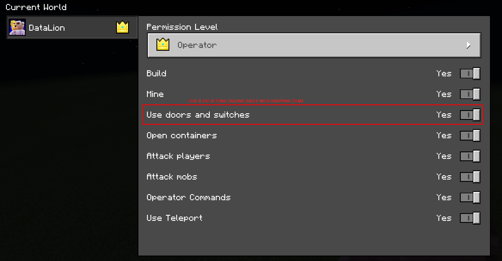 When changing the Player Permission setting: "Use doors and switches" to "no" it disabled more then just doors and switches it also disables dropping items for players.