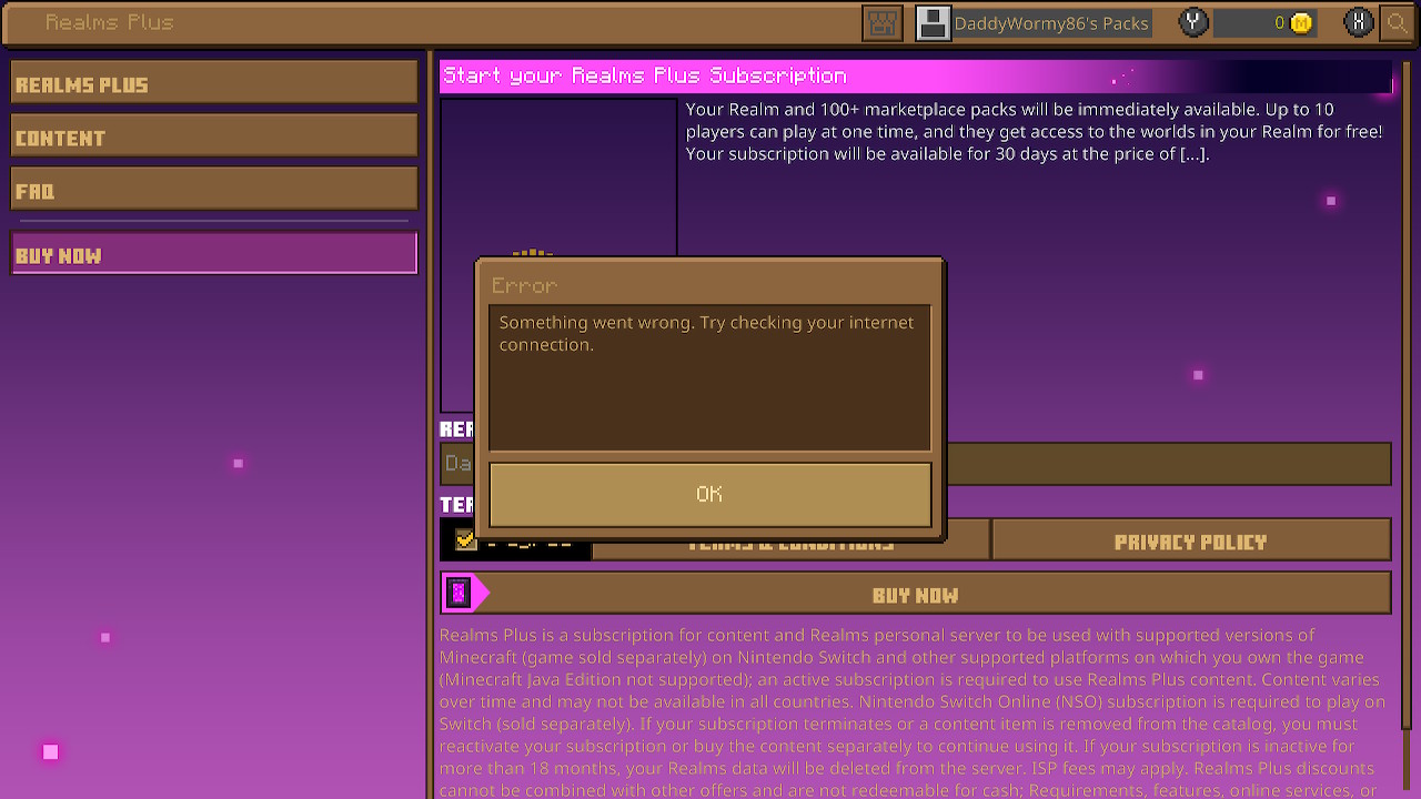 I am unable to get the Marketplace or Realms to load. It keeps telling me to check my internet connection, but my Switch is connected, and I'm able to play other online multiplayer games with no issues. I've also done things like remove the Switch from the dock and bring it closer to the AP and changing my DNS settings.
