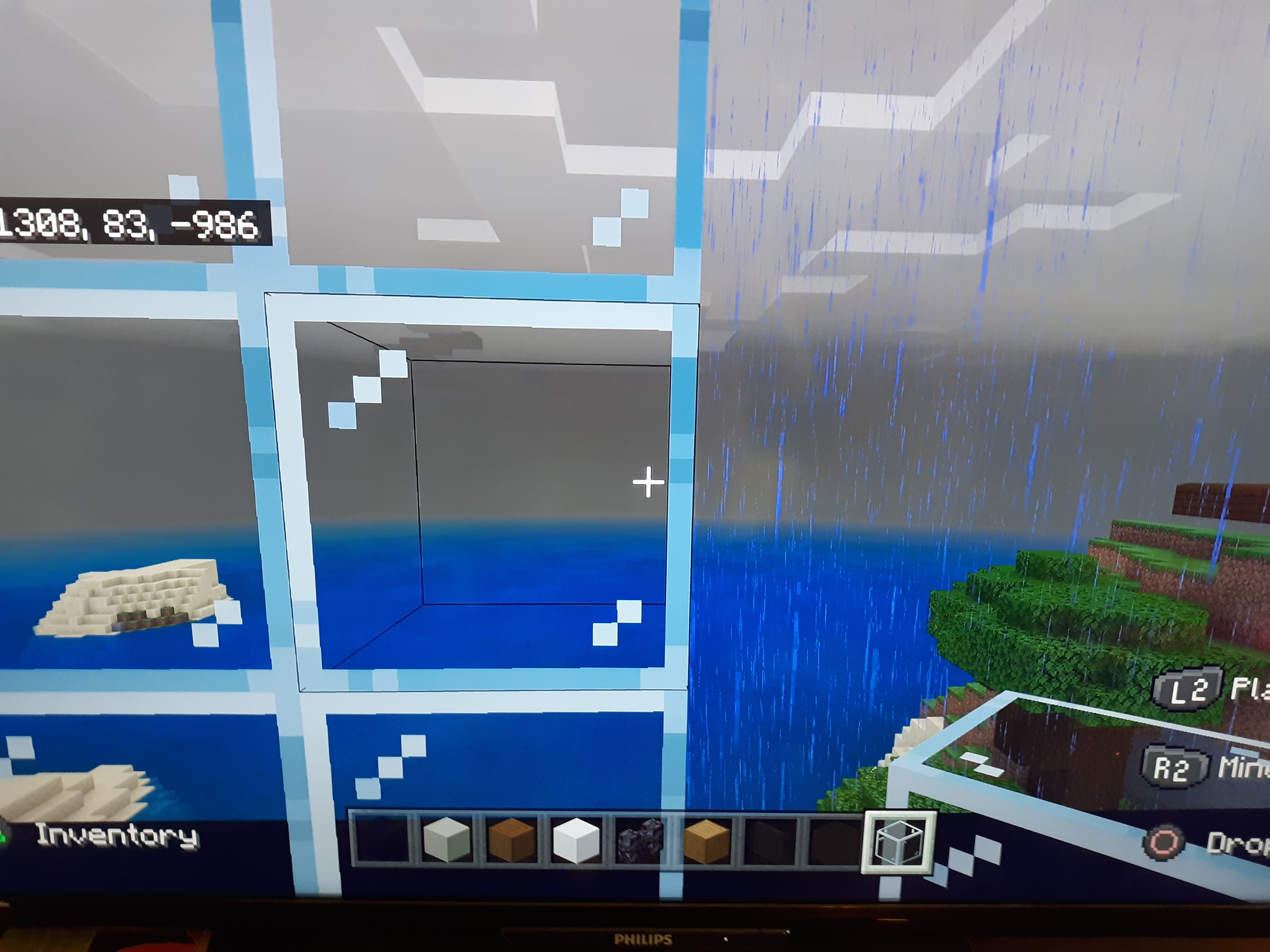 Whenever it's either raining or snowing, when you look through any block with opacity, such as ice or glass of any color, the weather effects are completely invisible. The only exception is that you can still see the splash when raindrops hit the ground.