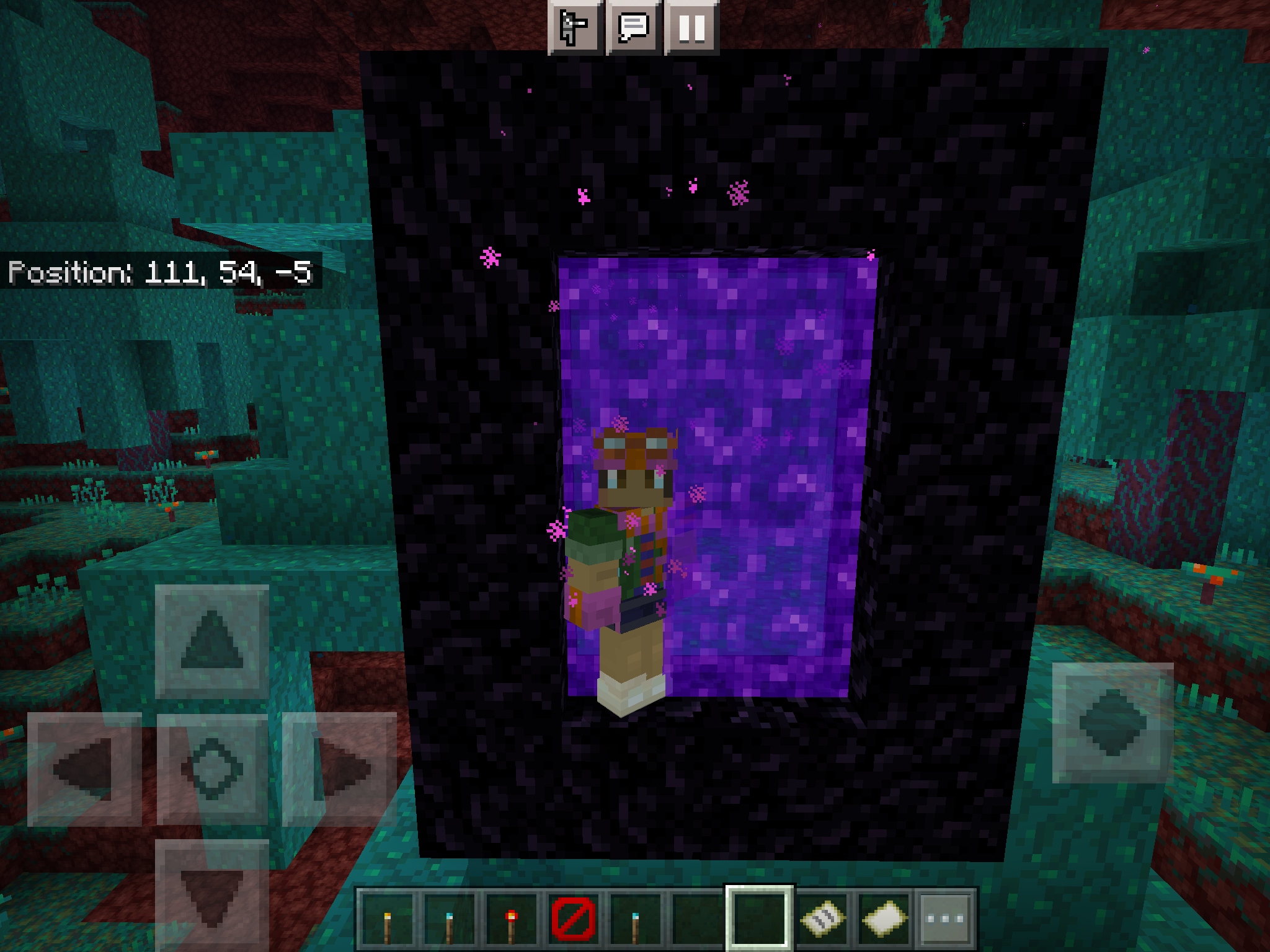 When reaching the nether portal another portal links to, continuing to stand inside of that portal causes the screen distortion and nether portal cube overlay to persist, despite the fact that this portal is currently incapable of actually teleporting the player in its current state and the player must first exit it. It seems that this does not always happen upon the portal's first creation, however.