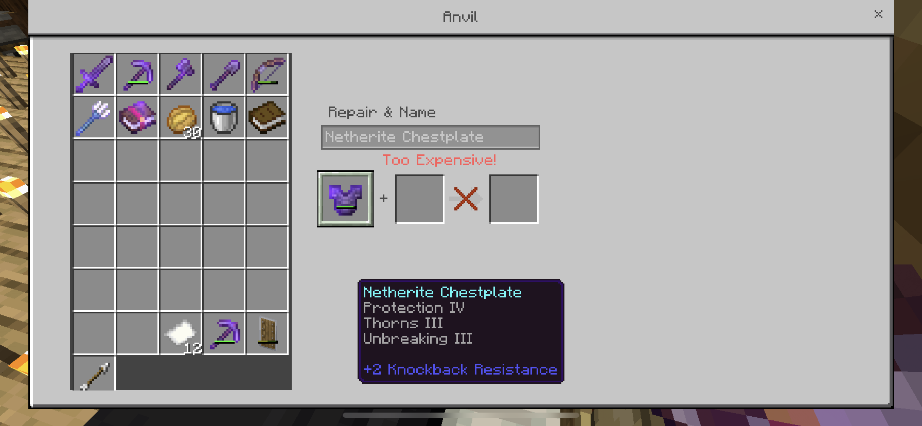 I don’t know if this happens to other players but my netherite chestplate has protection 4, thorns 3, and unbreaking 3. I have a mending book and by using an anvil, i try to put the mending on my chestplate but it says “Too Expensive” so I exited the game and re-opened it and it didnt work even when I took the book away and just left the chestplate on the anvil, it still says “Too Expensive”. I went to another world where I put the same enchantments and when i was trying to put in mending, it only cost 9 levels. Please get this fixed it took forever to get the enchantments.
