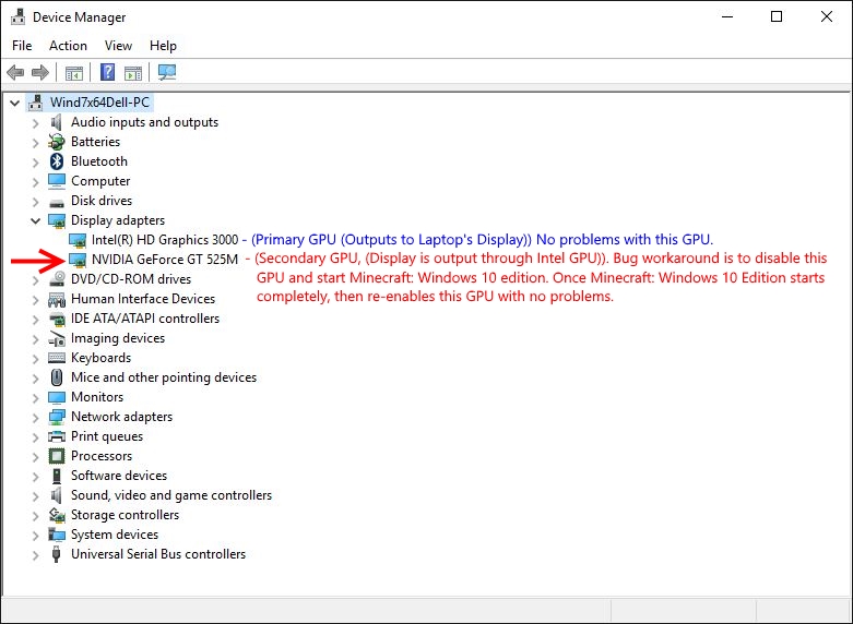 Starting with version 0.13.0, when I launch Minecraft: Windows 10 Edition on my laptop, Minecraft: Windows 10 Edition crashes immediately on the Mojang loading screen. I have an NVidia GeForce GT 525M (GF108) (Dell Inspiron 17R (N7110) with GeForce Driver 359.06 (crash also happens with GeForce Driver 353.00) and also have GPU: Intel HD Graphics 3000 (2nd Generation Intel Core i5-2410M), driver version: 9.17.10.4229. Crash only happens when the NVidia GeForce GT 525M (GF108) GPU is enabled. I can workaround the issue by disabling the NVidia GeForce GT 525M (GF108), letting Minecraft: Windows 10 Edition load to the Main Menu, then re-enable the NVidia GeForce GT 525M (GF108) GPU. This is frustrating because I have to use the workaround when I want to play Minecraft: Windows 10 Edition. Please fix this issue. This bug also exists in version 0.13.1.
