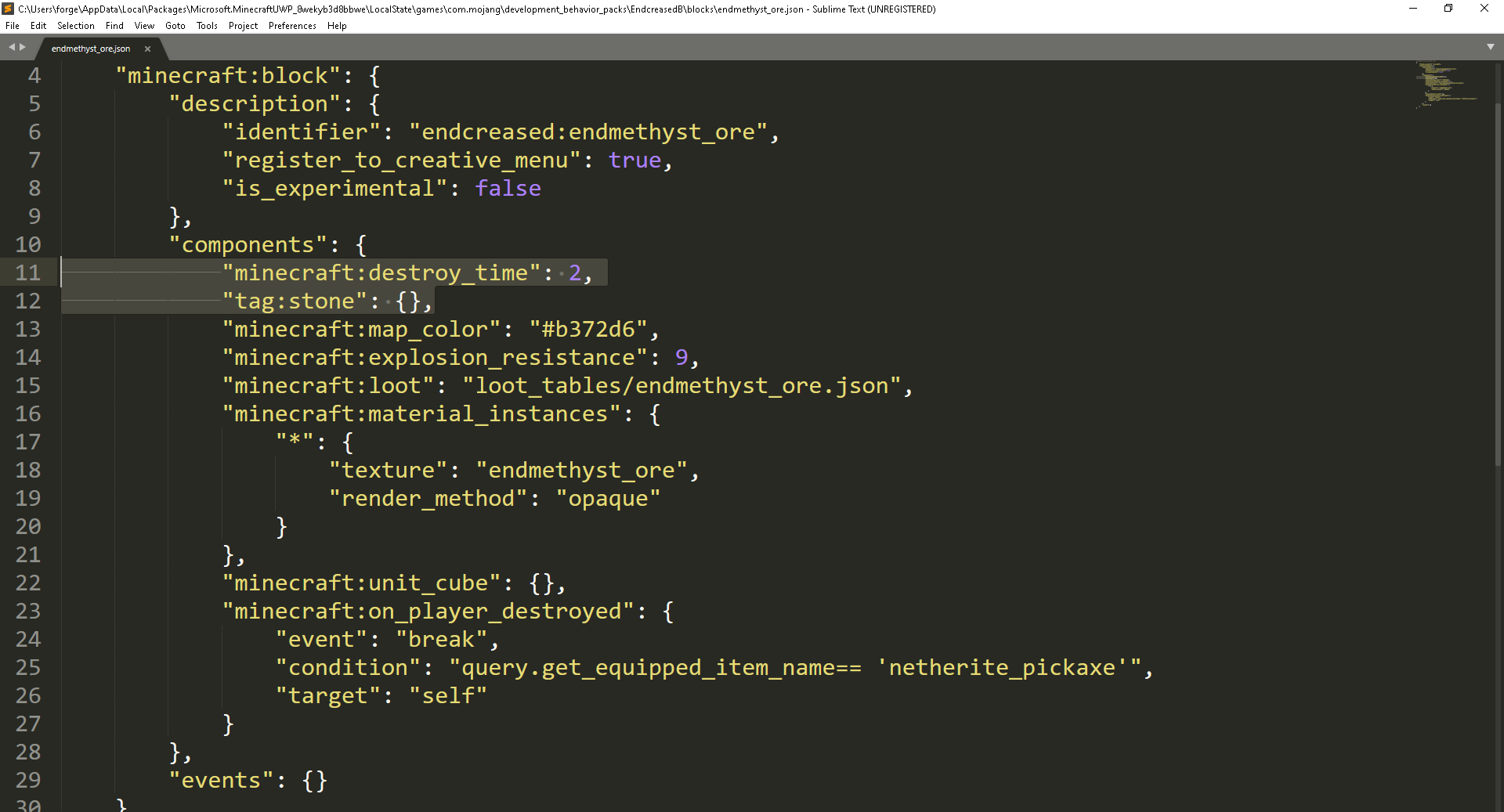 2. In the 'minecraft:components' make the 'minecraft:destroy_time' equal to 2 (the same as a vanilla log)