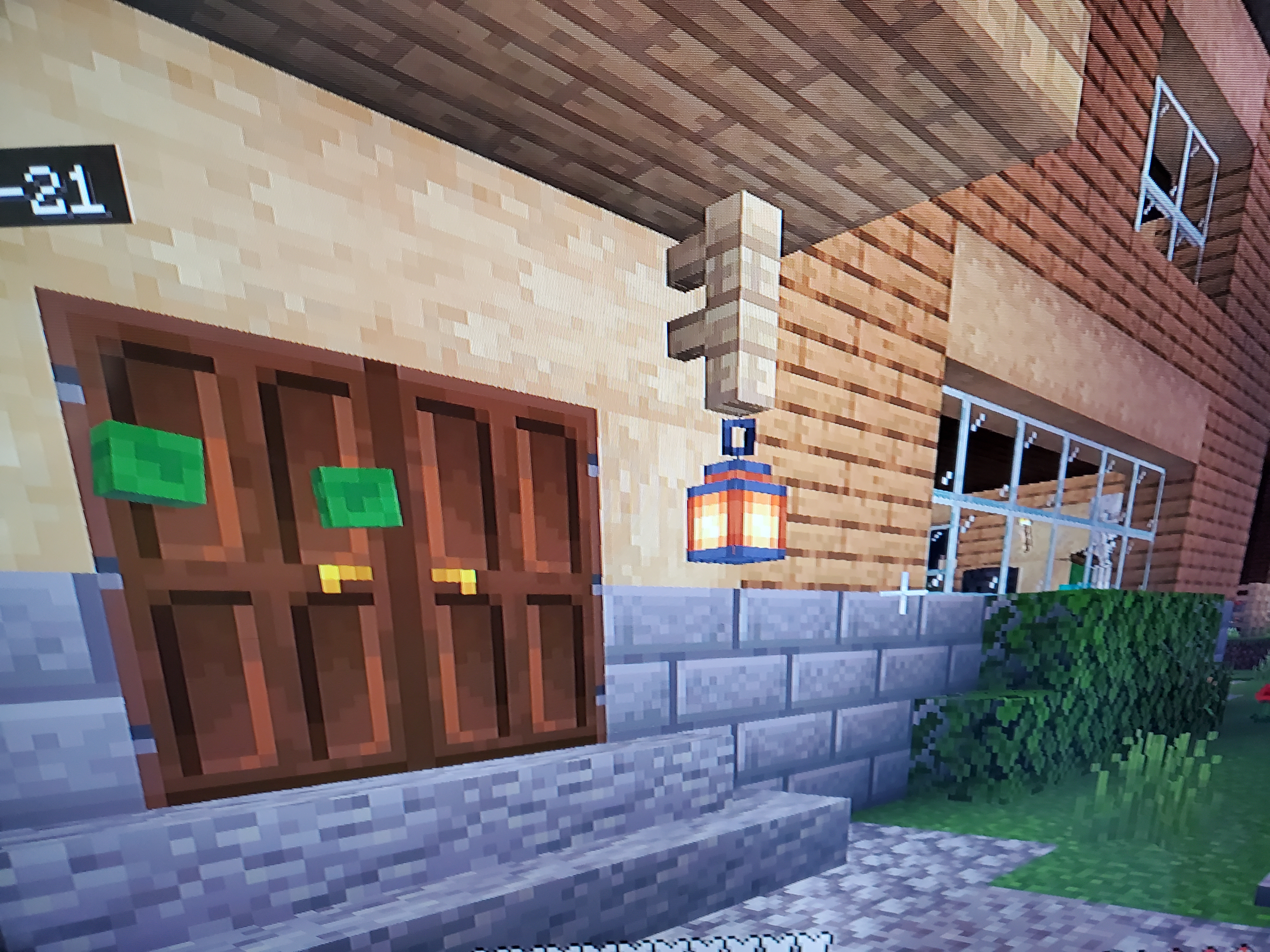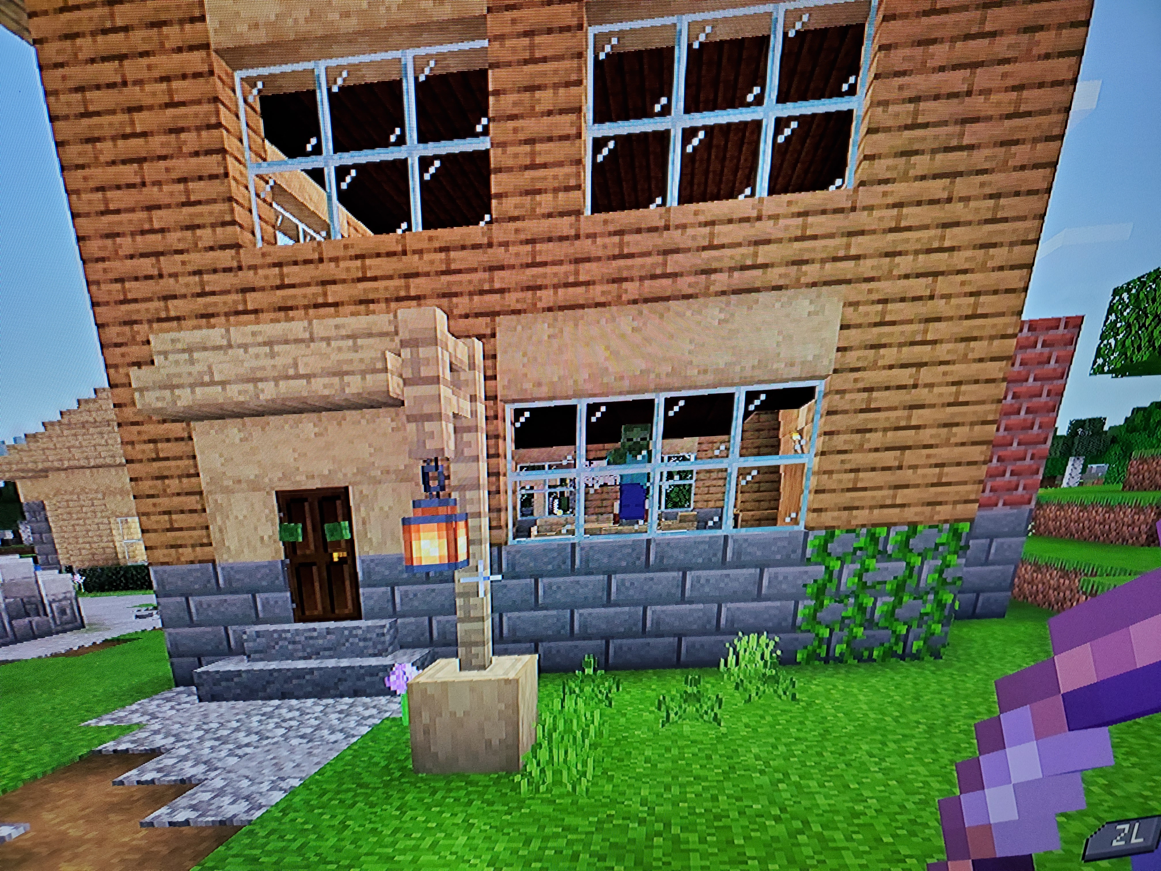 Sorry, the pictures are now showing in reverse. The first 2 pics (the building at dusk and the room with the golden armor on the stand) are of my rehabilitated zombie home. They third pic is the home where zombie hordes have been found multiple times. The large house with vines growing near the door his followed by a pic of what's inside said door (the fish tank, living room pic).