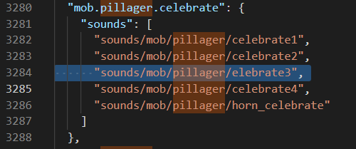 In sound_definitions.json, line 3284, a typo causes the third sound event for pillager celebrating is not played correctly. Check the image below.