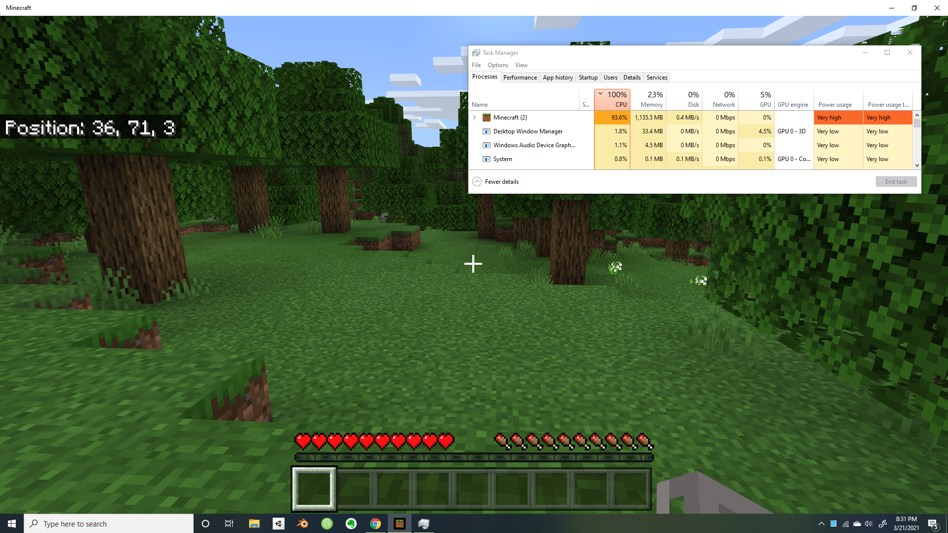 • Task manager shows Minecraft constantly running between 90-100% CPU while GPU stays at 0%