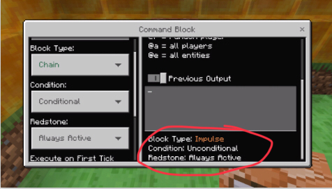 When I change a command block from an Impulse type to a chain command block, the words in the red circle are not correct. It changes the texture of the command block to a chain command block.