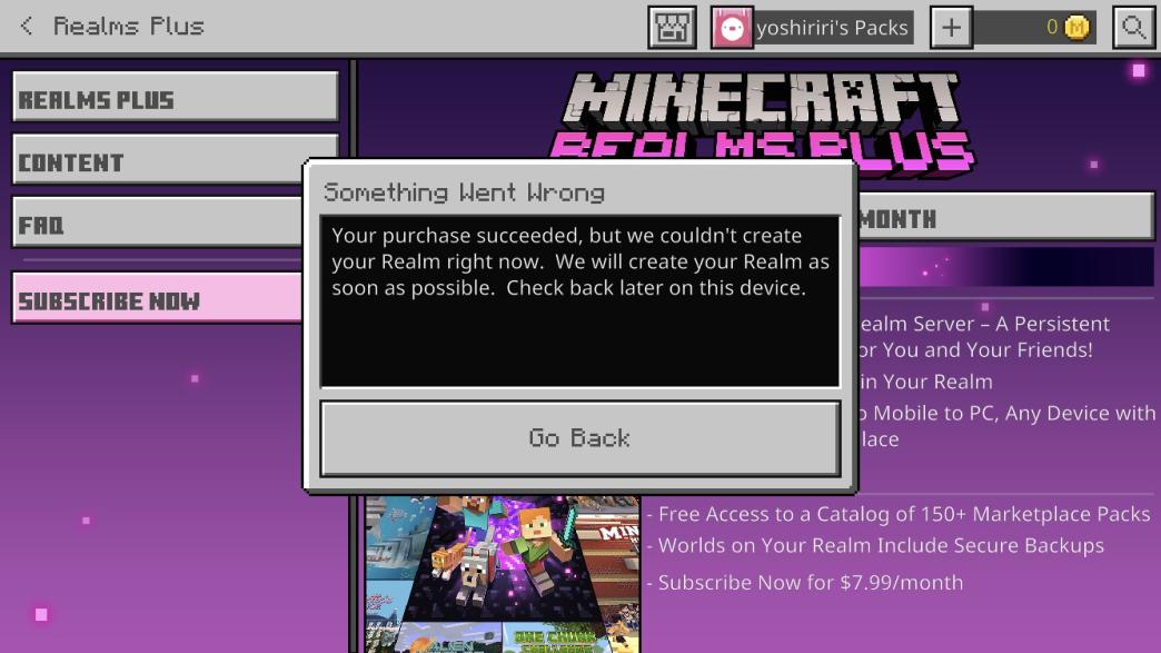 I bought a subscription for a realm, but an error keeps popping up. It reads, "Your purchase succeeded, but we couldn't create your realm right now. We will create your Realm as soon as possible..." This message has been popping up for four days now.