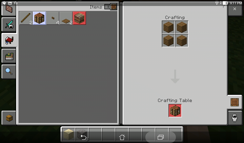 When I create a new world or enter a pre-existing one, crafting doesn't work correctly. All of the items show up in the recipe section but they have a red background even though I have the correct resources to craft them. I can't make a crafting table in my 2x2 matrix. The items graphics also appear off. The biggest example of this are the torches. They are missing the center portion when they are drawn in the world.