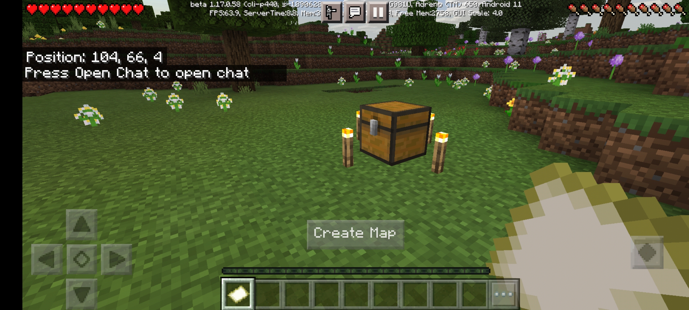 Spawn is 104, 66, 4. Chest with 4 torches generate next to player.