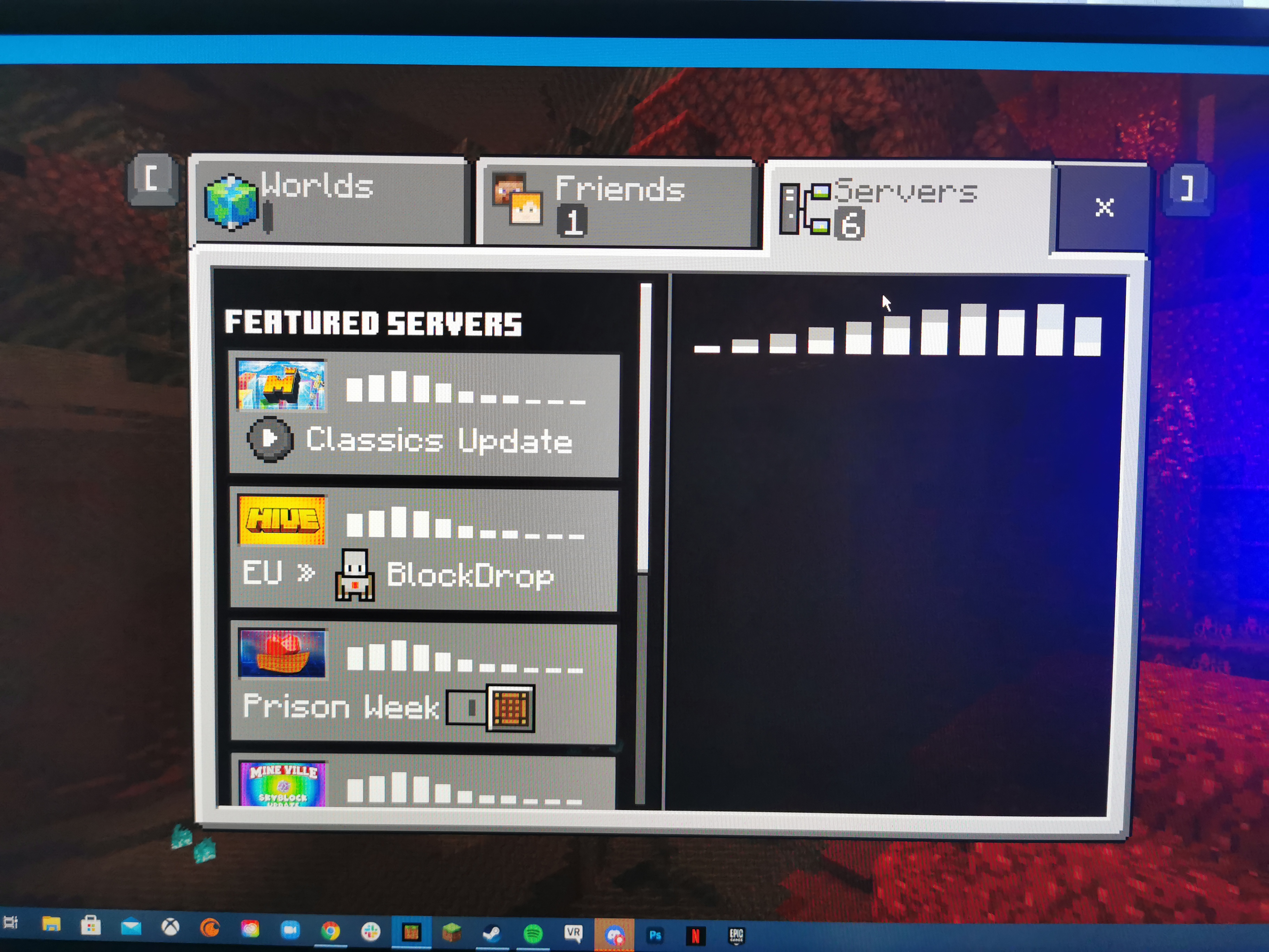 Recently none of the servers will load on my pc, it works fine on my phone and switch but I only really play on my pc so it is a big issue for me as I can no longer play online with my friends. It happened once before and I was able to fix it by deleting the game and redownloading it but in doing so I lost all of my worlds which was frustrating to say the least. I don't know what's going on but if a solution can be found without having to delete the whole game again that would be lovely. I've attached a photo of the loading screen, it never fully loads past there and I've tried just waiting on it but I ended up waiting for 10 minutes before I had to just leave it.