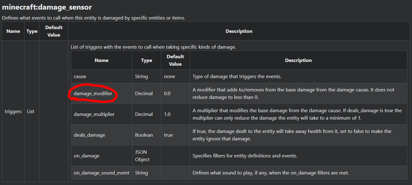 A component called "minecraft:damage_sensor" (according to bedrock.dev (Fig. 2), a trustworthy source for this sort of information) is supposed to have a sub-component called "damage_modifier." This sub-component allows us to directly add or subtract from the amount of damage an entity will take in a specific scenario. Unfortunately, it does not actually exist (Fig. 1, first error). This really sucks because while "damage_multiplier," another sub-component, does exist, it only changes the percentage of the damage taken, not the exact value. And speaking of the sub-component that does work, apparently it won't accept molang (Fig. 1, second error). Molang is a key importance in addons that a component should always be compatible with, whenever possible. Fig. 3 is the code that doesn't work because of these two issues. It is for the defense and damage reduction systems to an addon that adds Terraria content into the game, and as far as I know, there isn't another way to achieve this system, so I'm basically stuck with this broken system until these two issues get fixed (if they even get looked into ._.). If it helps, I can split this post into two different reports, one focusing on each issue, so when you guys update the resolution status, you can differentiate between the two.