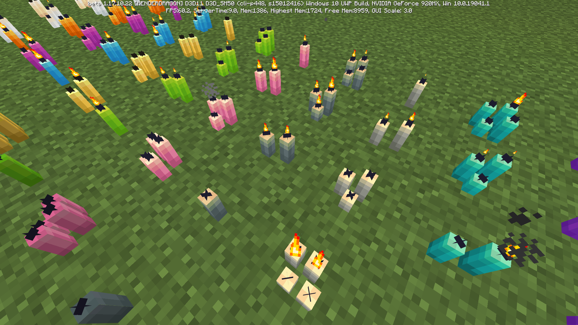 However, I think the real problem here is the (hard-coded) rate of candle flame particle emission and the duration of the particles. The emitter creates flame particles at random intervals between 0 and about 9 seconds. To ensure that at least one flame particle remains on a candle, each flame particle is set to last between 9 and 11.5 seconds. As a result, although some of the time a candle will only have 1 flame particle, each candle most of the time has several. Since each candle in a 4-candle block has its own flame emitter, a single 4-candle block often has dozens of candle flame particles at any given time. The max_particles setting for a particle time applies to the total number of particles rendered, and so it only takes three or four 4-candle blocks to hit the cap of 100 and start seeing flameless candles.